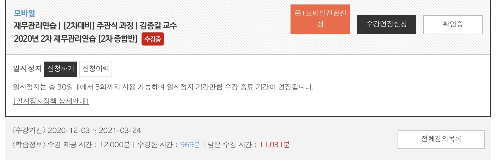 3/24일까지 수강시간 12000분 중 969분 사용, 11031분 남아있습니다.