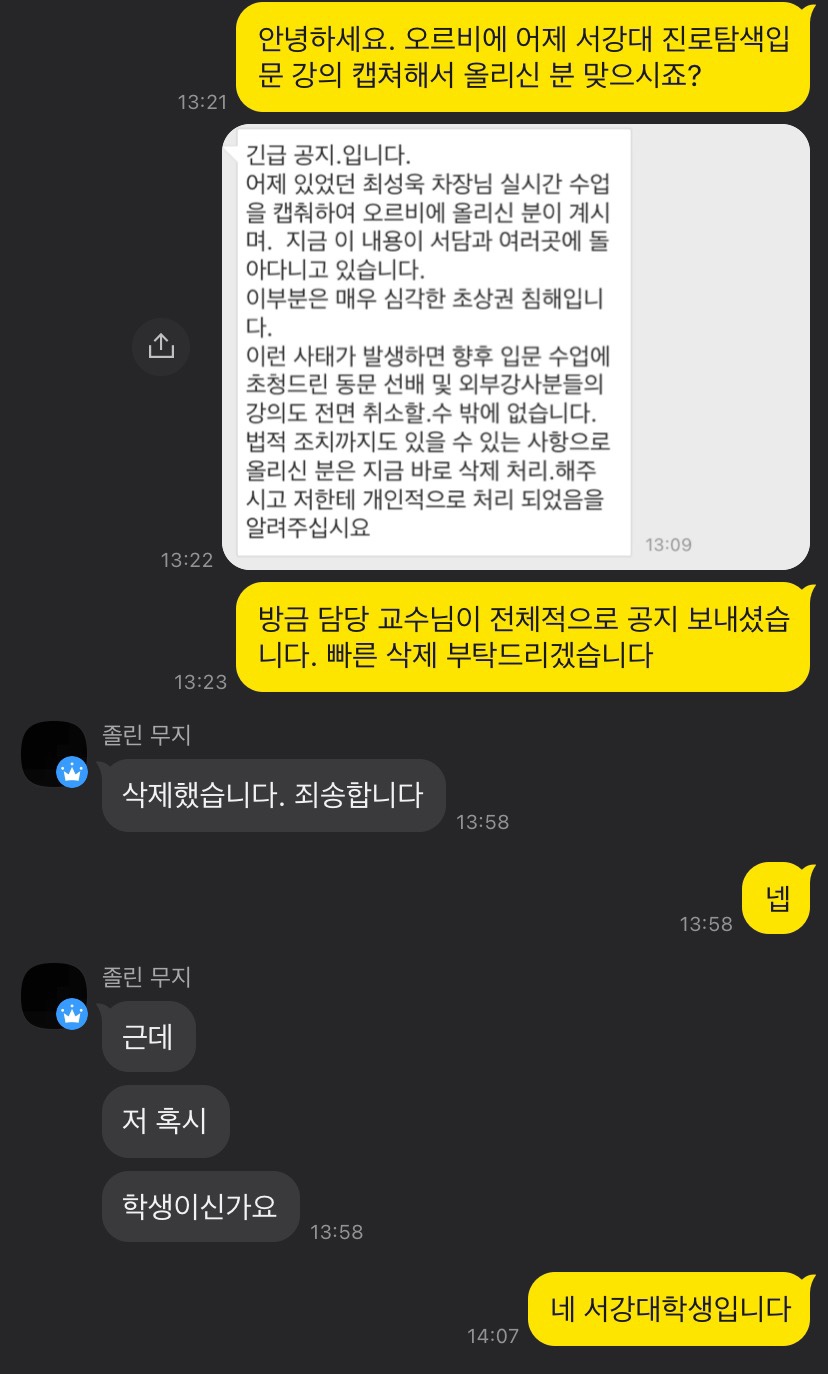 선생님이라고 하는걸 보면 과연 대학생이 맞는지조차 의심이 되는데, (아무리 실수라 그래도 두번이나..?) 취지팀도 글고 서담도 글코 여러모로 공유하는 사람들 조치가 필요할 것 같다ㅠ