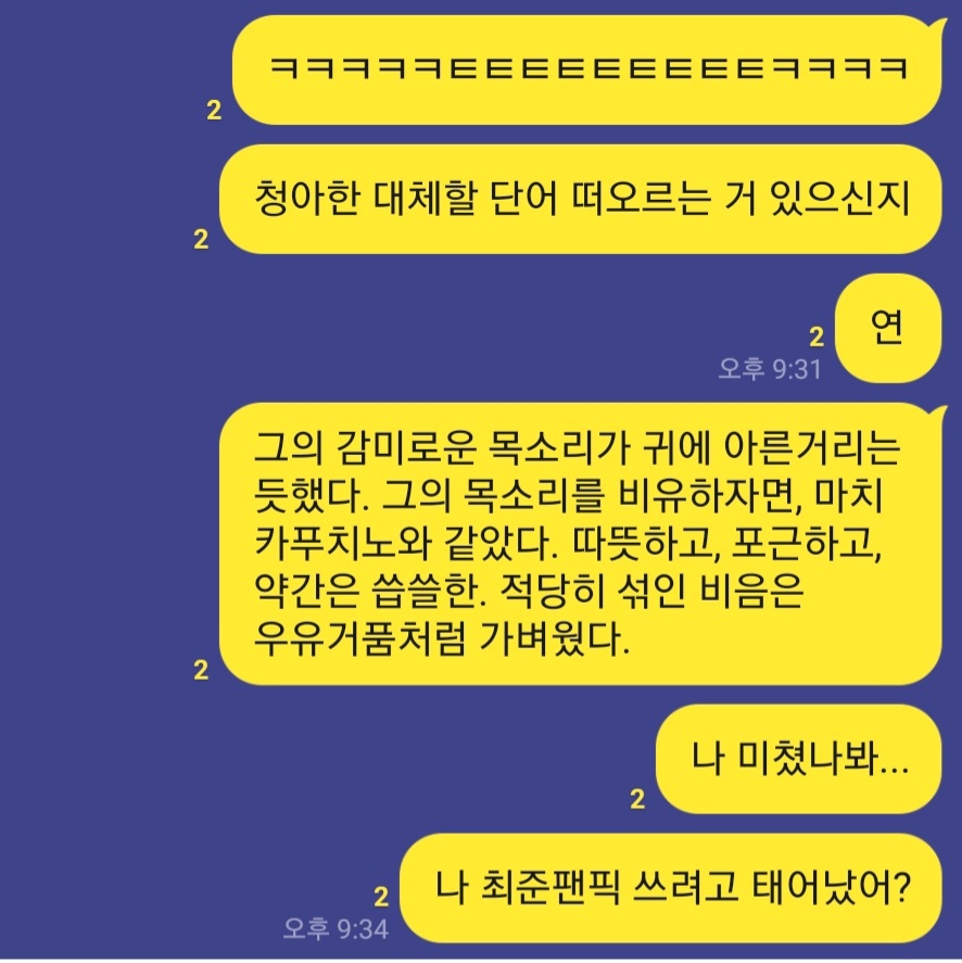 그의 목소리를 비유하자면, 마치 카푸치노와 같았다. 따뜻하고, 포근하고, 약간은 씁쓸한. 적당히 섞인 비음은 우유거품처럼.. 가벼우면서도 부드러웠다.