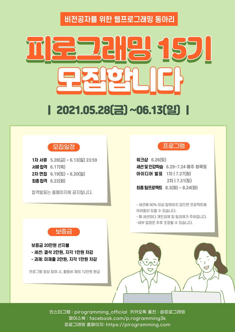 안녕하세요! 피로그래밍 운영진 입니다:) 현재 코로나 19 방역 수칙에 따라서 모든 활동은 비대면을 원칙으로 합니다.
