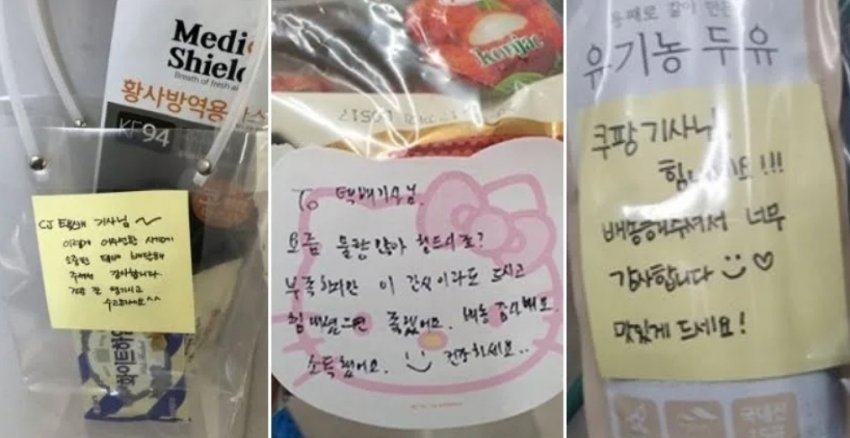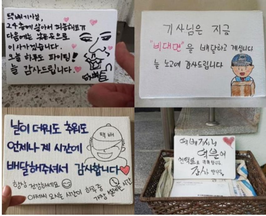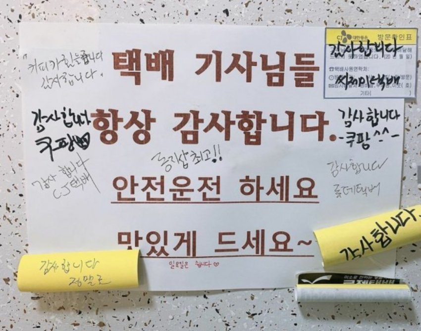 택배기사 혹사 관련해서 검색해보면 코로나 때문에 어떤 사건들이 벌어지고 있는지 관련 뉴스 많이 나와. 저 감사인사도 전부 코로나 시대 이후에 붙은 것들이고.