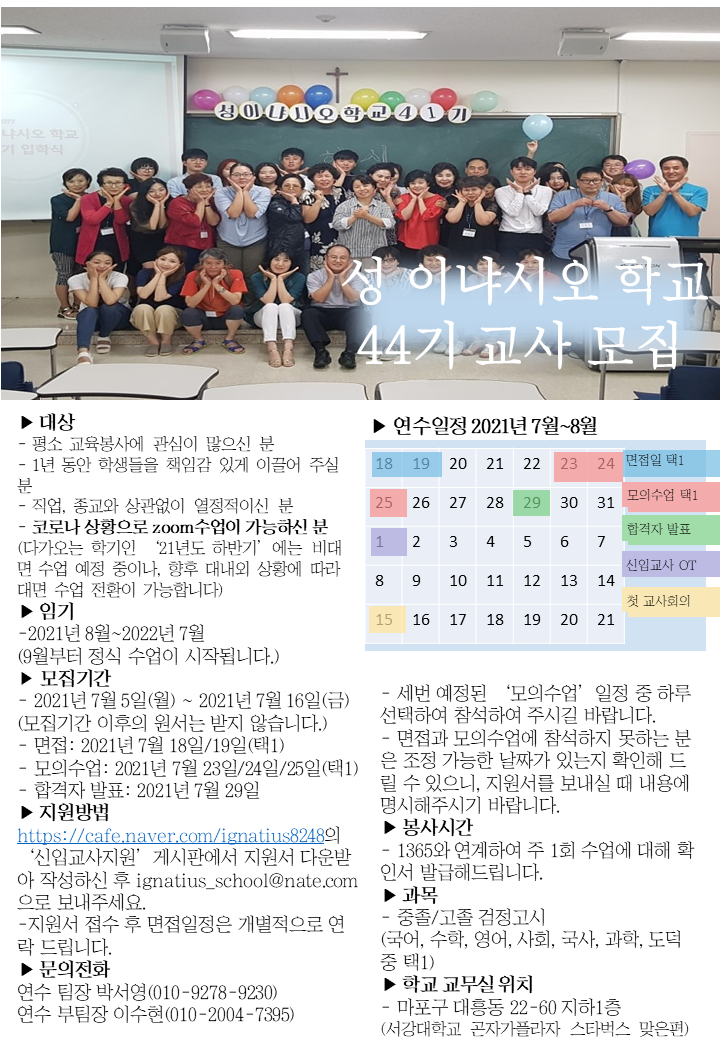 [교육봉사] 44년을 맞은 성 이냐시오 야학에서 새로운 선생님을 모집합니다. (~7/16)