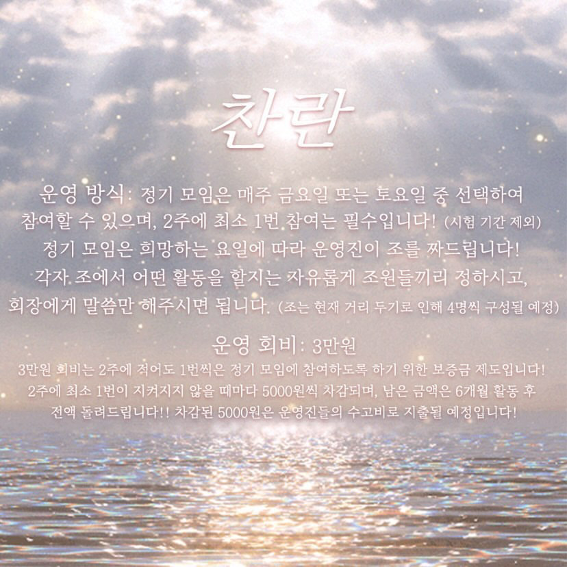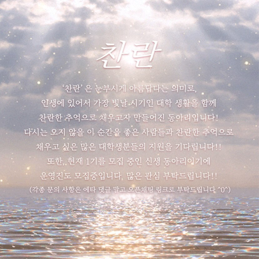 -동아리 소개: ’찬란‘은 눈부시게 아름답다는 의미로, 인생에 있어서 가장 빛날 시기인 대학 생활을 함께 찬란한 추억으로 채우고자 만들어진 동아리입니다! 다시는 오지 않을 이 순간을 좋은 사람들과 찬란한 추억으로 채우고 싶은 많은 대학생분들의 지원을 기다립니다!! 또한, 현재 1기를 모집 중인 신생 동아리이기에 ‘운영진’도 모집중입니다. 많은 관심 부탁드립니다!!