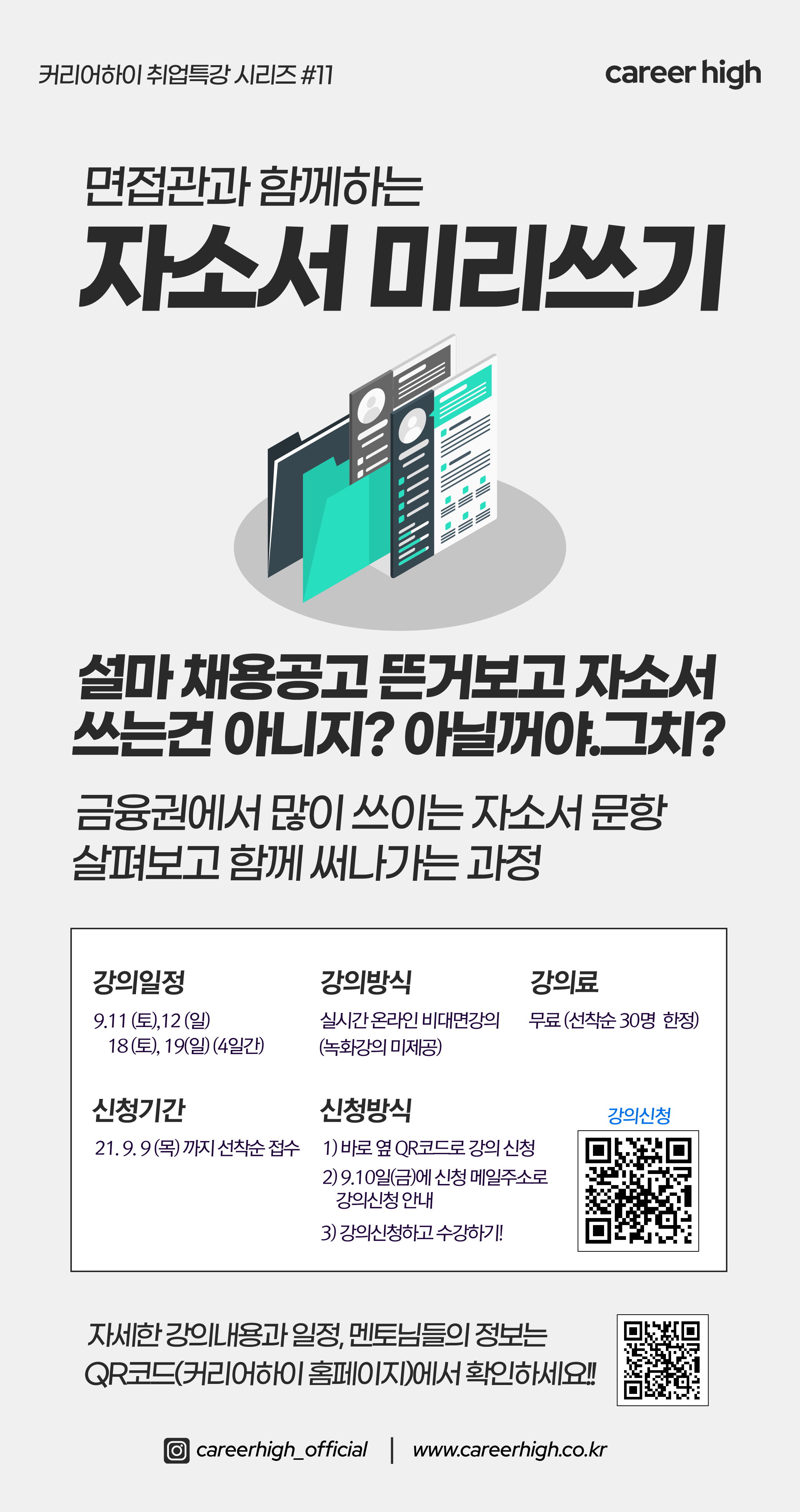 [홍보] [선착순 100명 무료특강] 5명의 면접관과 함께하는 금융권 채용공고 언빡싱 / 자소서 미리쓰기 (오늘 마감)