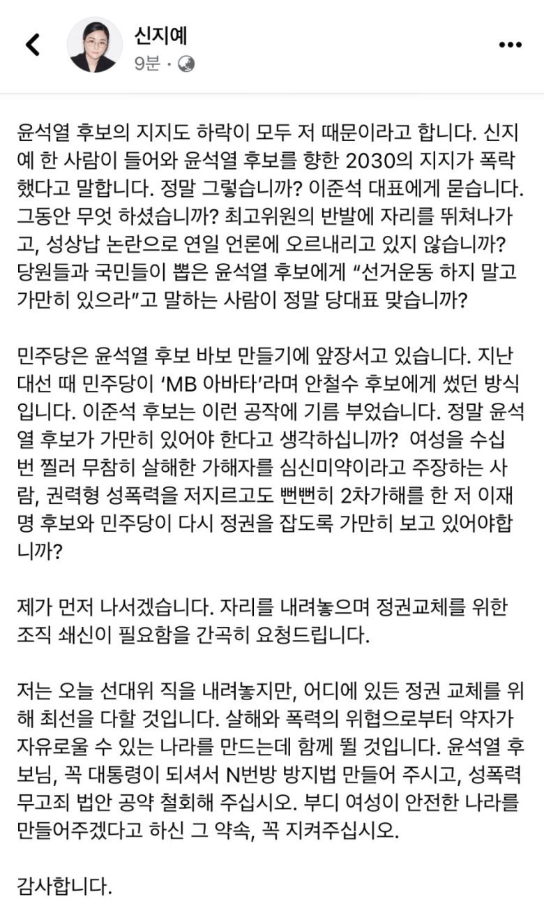 3. 단순히 지지율 하락이 신지혜 하나뿐인게 아니라 지금까지 윤석열이 보여줬던 정체성없고 방향이랑 내용도 없는 인사정책, 공약이 문제고 진성페미인 신지혜의 영입이 가장 병크를 터트렸을뿐, 되도 않는 물타기 하지 말고 실제로 지가 가장 큰 문제임을 모르는 저딴 인간은 빨리 꺼지는게 맞지