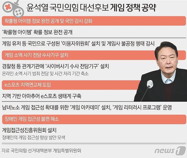 (서울=뉴스1) 최동현 기자,김유승 기자 = 윤석열 국민의힘 대선 후보는 12일 '확률형 아이템'의 정보를 완전히 공개하겠다고 공약했다. 또 게임 이용자로 구성된 '이용자위원회'를 설치해 게임회사의 불공정 행태를 감시하고, 처벌을 강화하는 방안을 제시했다.