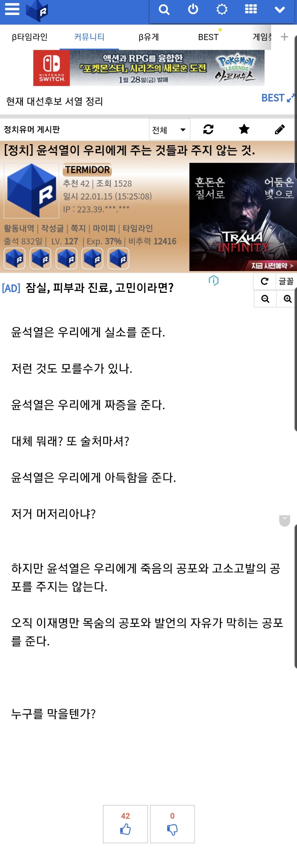 클리앙 빼고 지금 전통 친문 커뮤니티 윤석열로 다돌아섬. 특히 그 녹취록에서 윤석열이 원래 문재인지키려고 조국친거다 이게 컷던거 같음. 반면에 녹취록자체가 보수에 타격은 거의 없을듯. 과거에 좌파였던건 원래 보수 거물급 정치인의 기본 커리어이기 때문.
