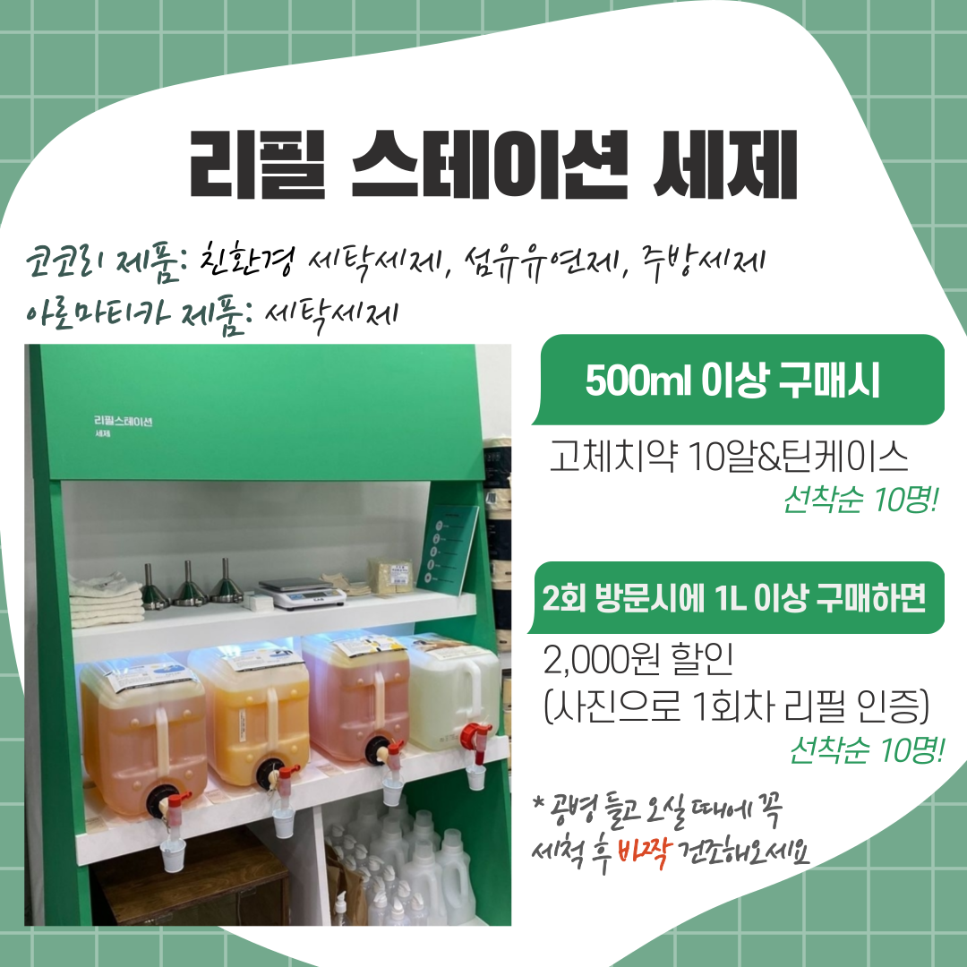- 리필 스테이션 운영: 공병을 가져오시면 친환경 세제를 리필해드립니다! 저희가 팔고 있는 코코리 세제는 자연에서 유래한 성분들로 만들어져 안심하고 쓸 수 있어요.
