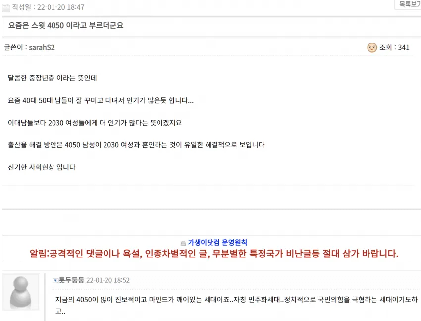 아니 애초에 저기 틀리앙하는사람들아니냐 ㅋㅋㅋㅋㅋㅋㅋㅋ 진짜 멋진 4050은 저딴 병신들 집합소에는 없겠지 ㅋㅋㅋㅋㅋㅋㅋㅋㅋ
