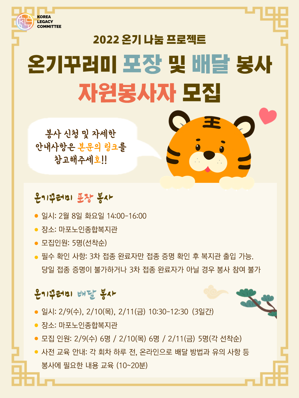- 필수 확인 사항: 3차 접종까지 완료했다는 접종 증명 확인 후에만 복지관 내 출입이 가능합니다. 당일 접종 증명이 불가하거나 3차 접종 완료자가 아닐 경우 봉사 참여가 불가합니다.