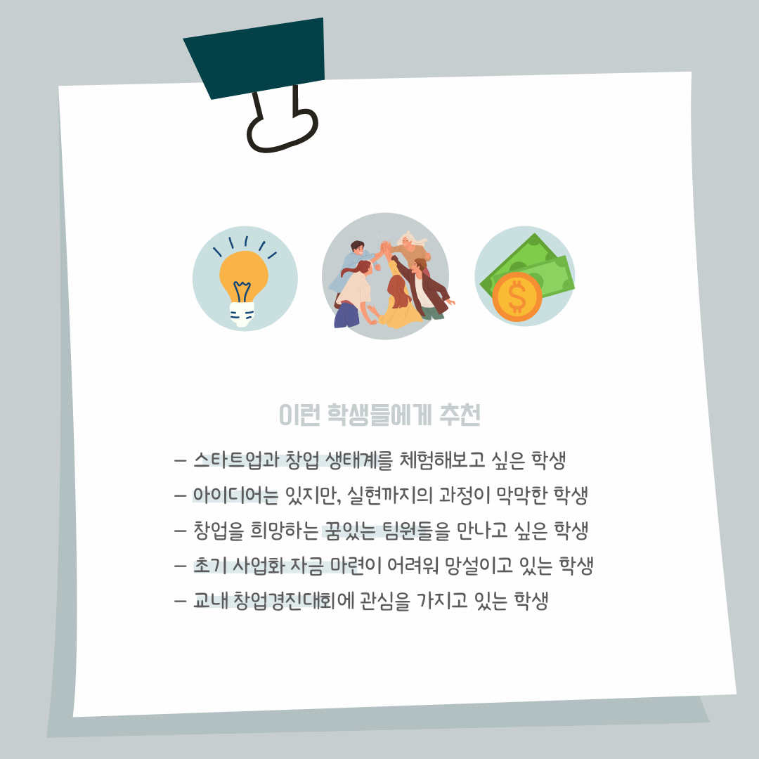 스타트업과 창업 생태계를 체험하고 싶은 학생, 창업 아이디어를 가지고 있는 학생, 뜻이 맞는 팀원들을 모집하고 싶은 학생, 초기 사업화 자금이 필요한 학생, 창업경진대회에 참가할 계획이 있는 학생분들께서는 "실전 스타트업"을 꼭 수강해보세요-!