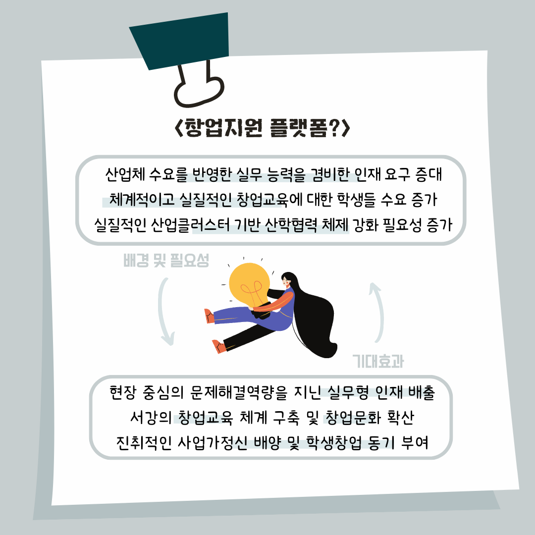 산업체 수요를 반영한 실무 능력을 겸비한 인재 요구 증대, 체계적이고 실질적인 창업교육에 대한 학생 수요 증가, 실질적인 산업클러스터 기반 산학협력 체제 강화 필요성 증가 라는 사회적 배경의 변화에 발맞추어 창업지원 플랫폼을 구축하고, 현장 중심의 문제해결역량을 지닌 실무형 인재 배출, 서강의 창업교육 체계 구축 및 창업문화 확산, 진취적인 사업가정신 배양 및 학생창업 동기부여라는 목표에 도달하고자 합니다.