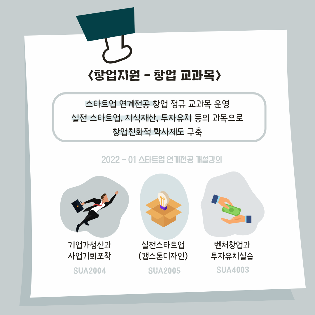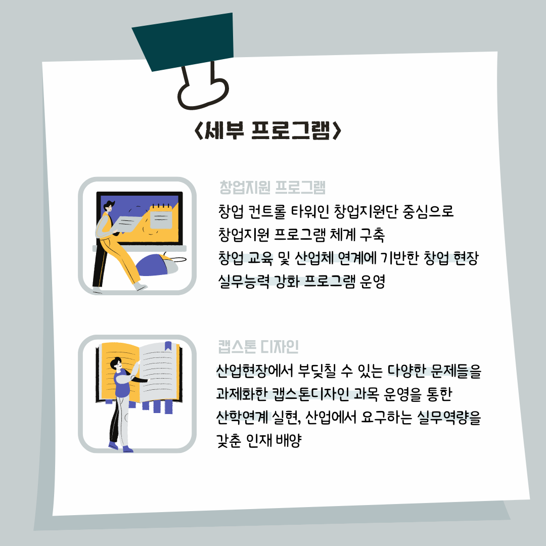이 창업지원 플랫폼 사업은 크게 창업지원 프로그램과 캡스톤 디자인 과목 운영으로 나누어지는데요, 오늘은 창업 교과목에 조금 더 집중하여 소개를 드릴 예정입니다.