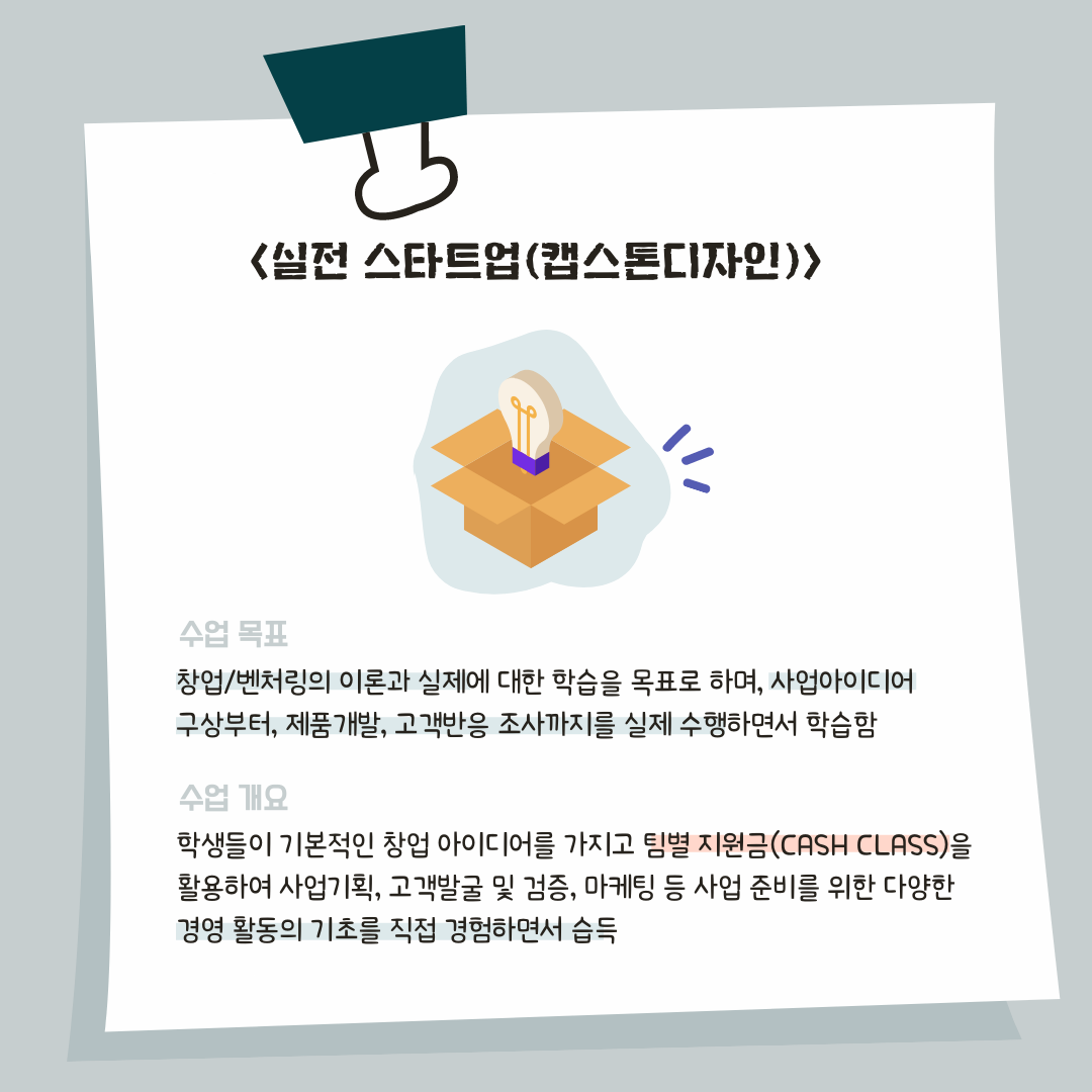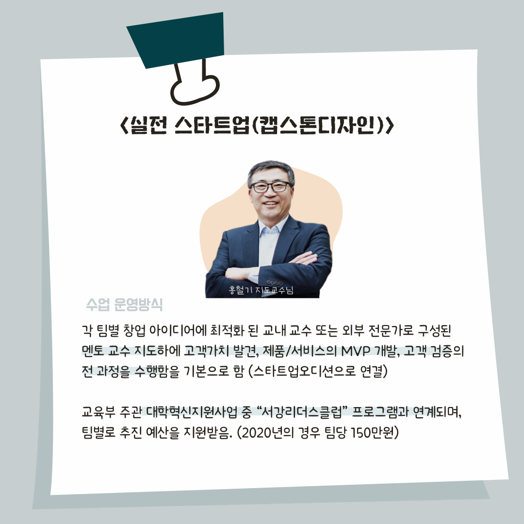 이 중 실전 스타트업의 경우, 창업/ 벤처링의 이론과 실제에 대한 학습이 이루어지는 과목이며, 학생들의 창업 아이디어를 사업화하기 위해 제공되는 팀별 지원금(150만원~200만원 상당)을 활용하여 경영활동의 기초를 직접 경험하고 습득하는 강의입니다.