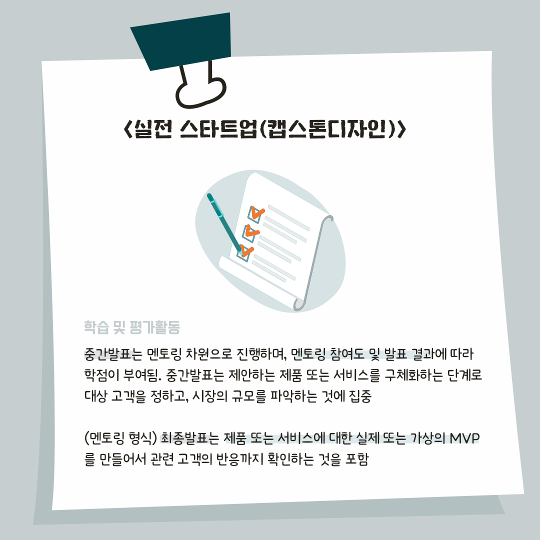 캡스톤 디자인 수업답게, 중간발표와 최종발표는 필답형 시험이 아닌, 멘토링 참여 및 창업과정에 대한 발표에 대해 평가가 이루어지니 학습과 성적에 대한 부담 또한 덜어낼 수 있을 것 같습니다.