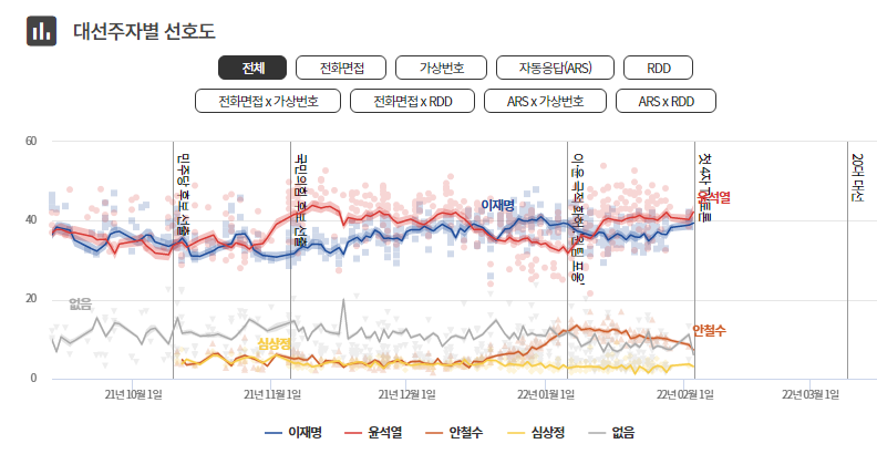 모든 여론 조사들 조사방법론 차이까지 다 고려해서 베이지안 모형 이용해서 실시간으로 지지율 추이 업데이트 하는 방식인데 소위 말하는 민심 트렌드 읽기에는 이게 제일 좋음