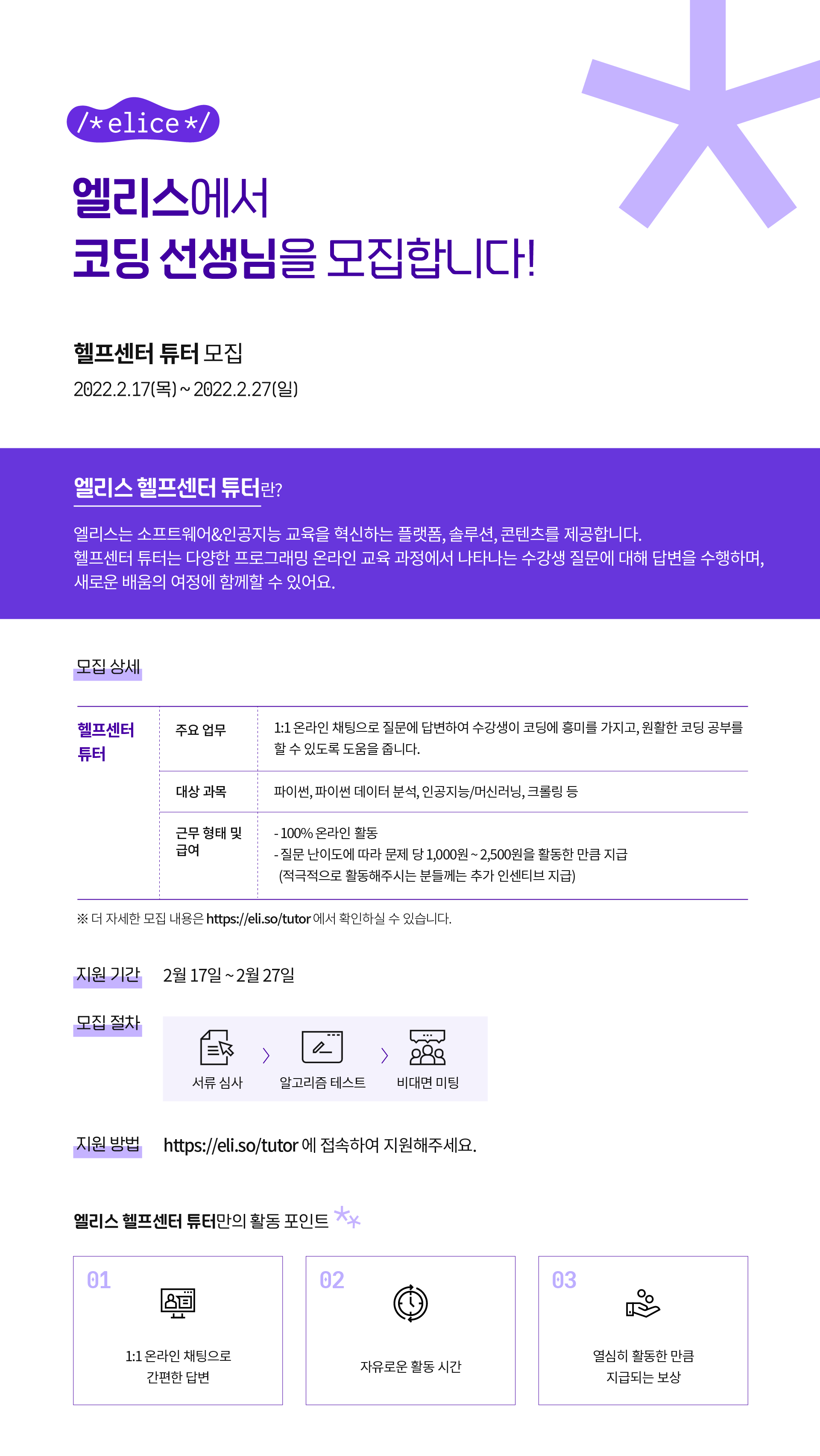 [엘리스] 헬프센터 튜터 모집 안녕하세요! 코딩에 대한 지식을 가지고 친절한 선생님이 되어주실 헬프센터 튜터를 모집하고 있습니다. ❓ 엘리스 헬프센터 튜터란? 엘리스는 소프트웨어&인공지능 교육을 혁신하는 플랫폼, 솔루션, 콘텐츠를 제공합니다. 헬프센터 튜터는 다양한 프로그래밍 온라인 교육 과정에서 나타나는 수강생 질문에 대한 답변을 수행하며, 새로운 배움의 여정에 함께할 수 있어요. ※주요 업무 1:1 온라인 채팅으로 질문에 답변하여 수강생이 코딩에 흥미를 가지고, 원활한 코딩 공부를 할 수 있도록 도움을 줍니다. ※대상 과목 파이썬, 파이썬 데이터 분석, 인공지능/머신러닝, 크롤링 등 ※근무 형태 및 급여 - 100% 온라인 활동 - 질문 난이도에 따라 문제 당 1,000원~2,500원을 활동한 만큼 지급(적극적으로 활동해주시는 분들께는 추가 인센티브 지급) ※지원 기간 2월 17일 ~ 2월 27일 ※모집 절차 서류 심사 -> 알고리즘 테스트 -> 비대면 미팅 ※지원 방법