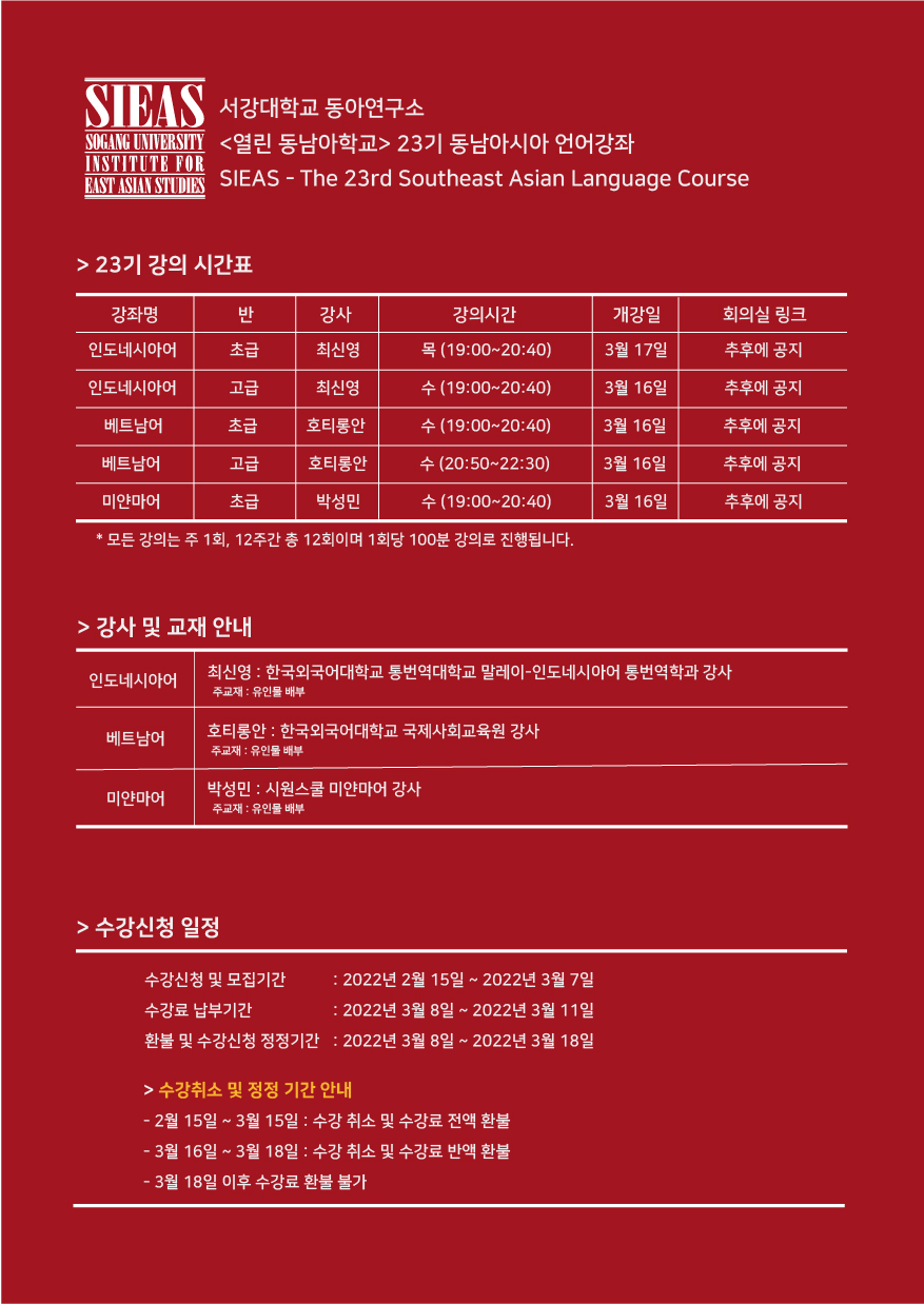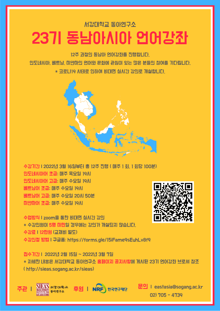 [서강대 동아연구소] 제23기 동남아시아 언어강좌 수강생 모집합니다!