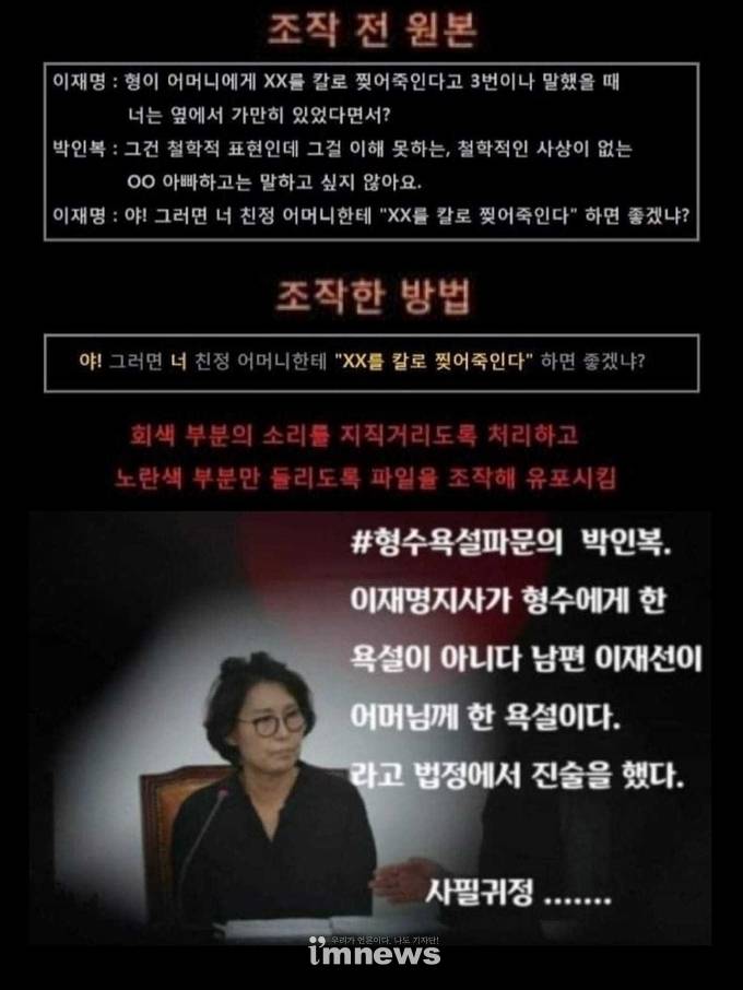 글로 휘적어 놓으면 그게 근거가 되는게 아니잖아. 저걸 저렇게 주장하려면 원본 파일이라도 있어야하는거고, 그 반대 녹취는 있는 반면, 쟤네들이 주장하는 녹취가 없으면 저거는 그냥 헛소리에 불과한거지. 내가 아인슈타인의 환생이라고 주장하려면 그걸 증명할 근거가 있어야할 것 아니야 근거가.