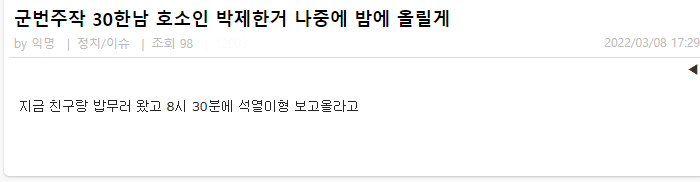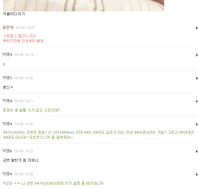 내가 좆 달릴 수가 없는 수준이라고 쓴 댓글 위에 익2가 자기 30대 남자다, 군필이고 군번이 947610292x다 라고 댓글 썼었음.