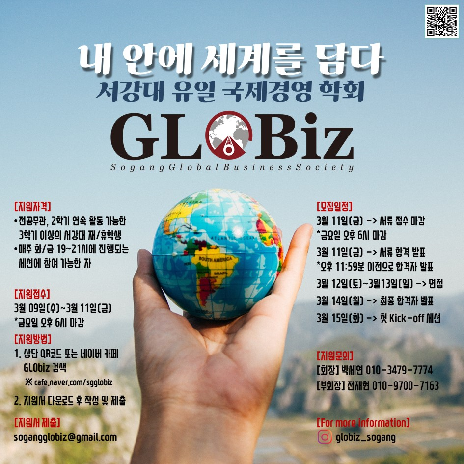 안녕하세요! 교내국제경영학회 [GLOBiz]가 2022년 봄학기 신입부원 추가모집을 시작했습니다.[3월 9일(수)~3월 11일(금) 18:00분 마감]