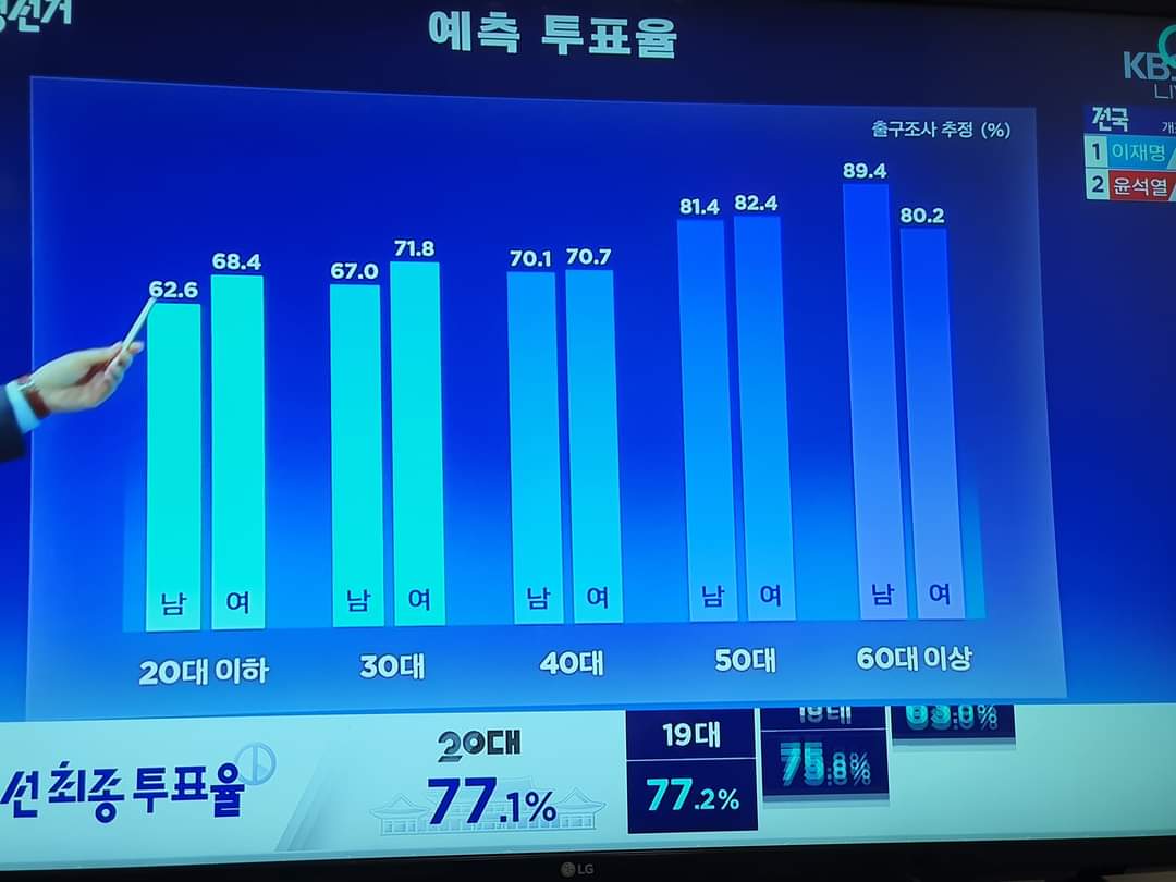 사전투표 개표한 것도 3%수준 차이였는데 그마저도 호남 먼저 개표한 거 고려하면 실질적으로 2% 차이날까말까인 사전투표 득표율인데 ㅋㅋ 이대남 윤석열 58%? 그딴 개같은 보정이 어딨냐 이제 50퍼 깠고 본투표 20%도 안 깠는데 따라잡힘 ㅇㅇ