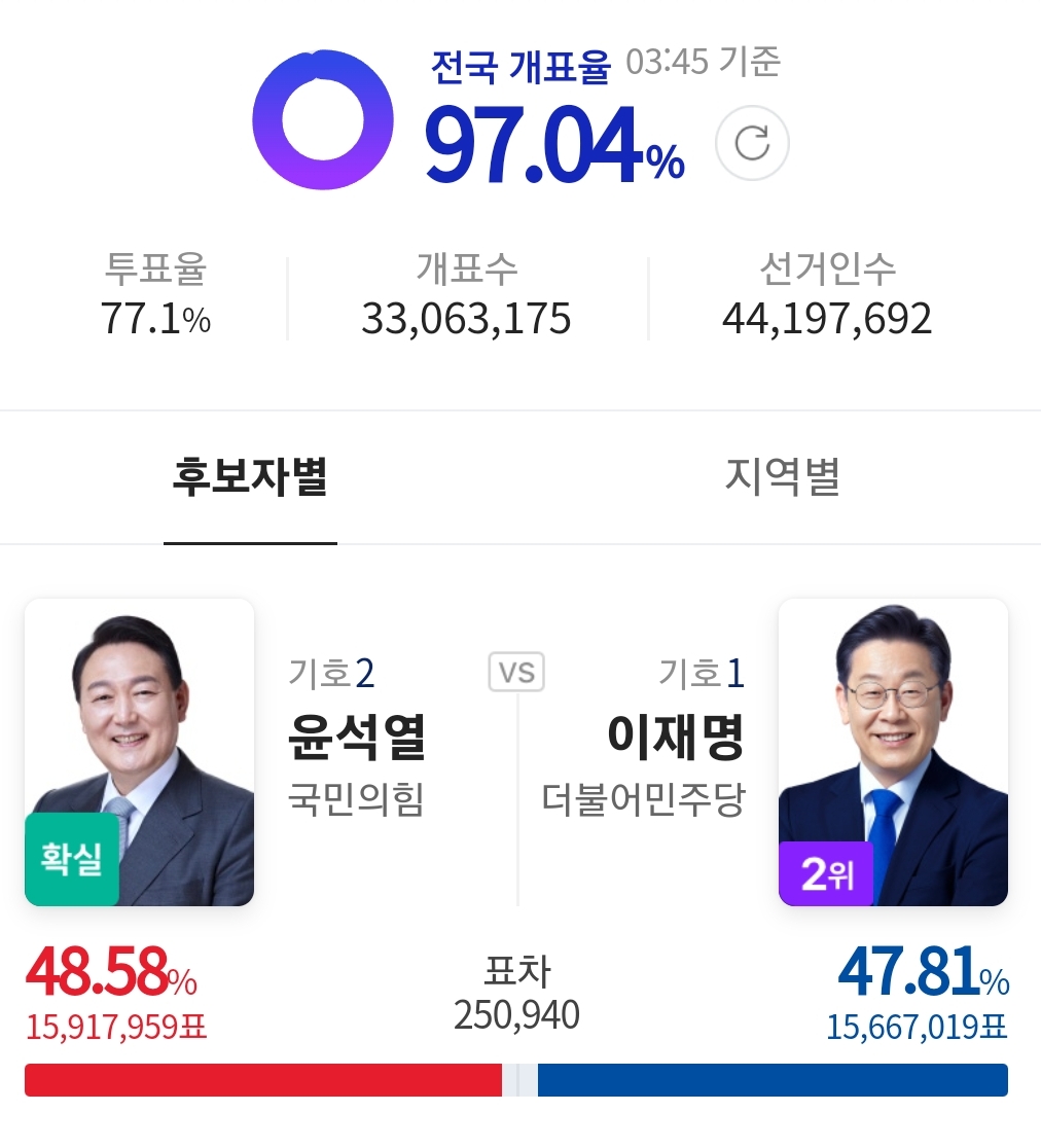 이재명은 정확히 맞췄네 진짜 ㅋㅋㅋ 윤석열도 0.1퍼 차이 ㅎㄷㄷ