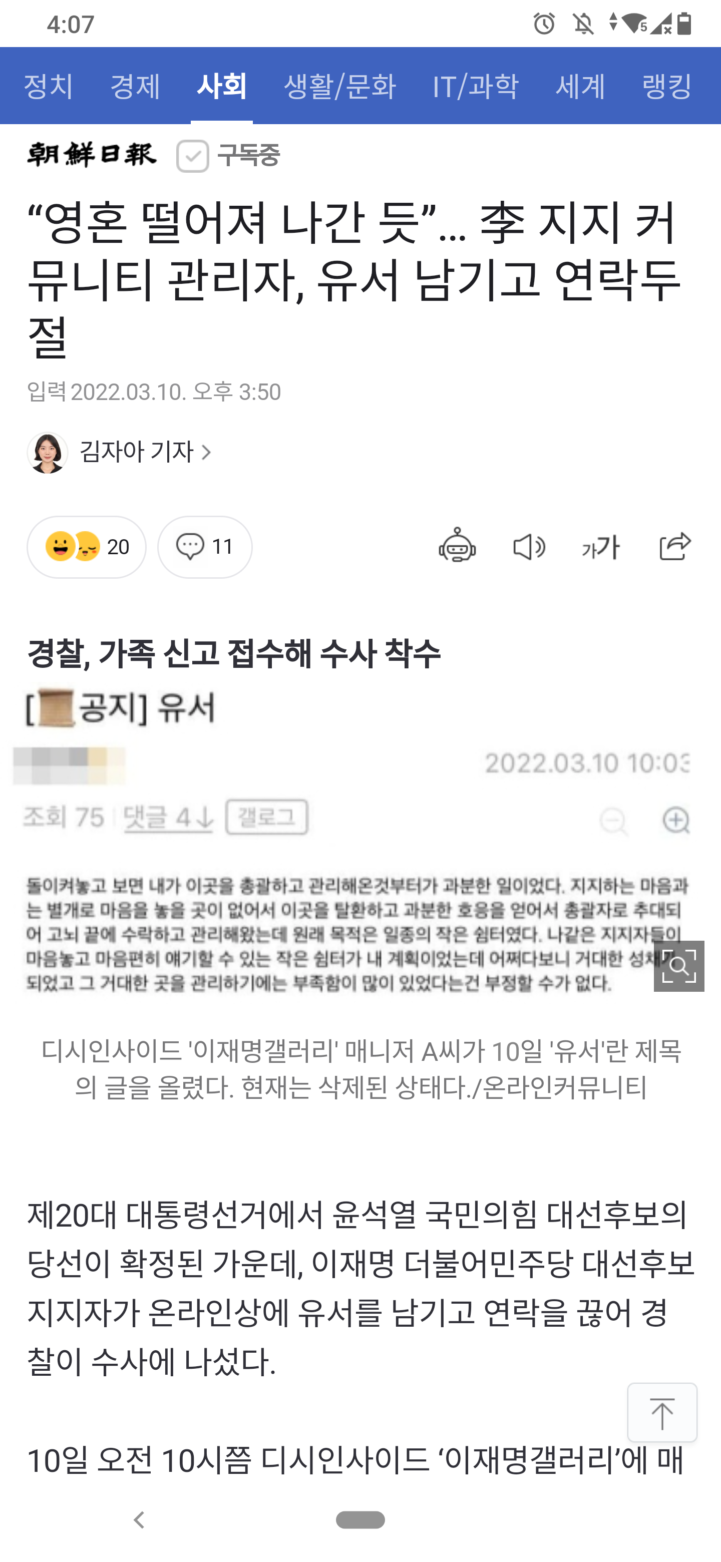 이재명 갤 관리자 유서남기고 연락두절 ㄷㄷ