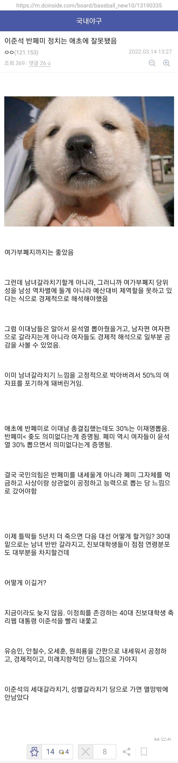 알아서 정의당 뽑을 표를 결집시킨 데에 대한 책임을 요하는 것이지 이준석 니가 1부터 100까지 잘못 했다고 하는 게 아닌데 여긴 대깨준만 남음