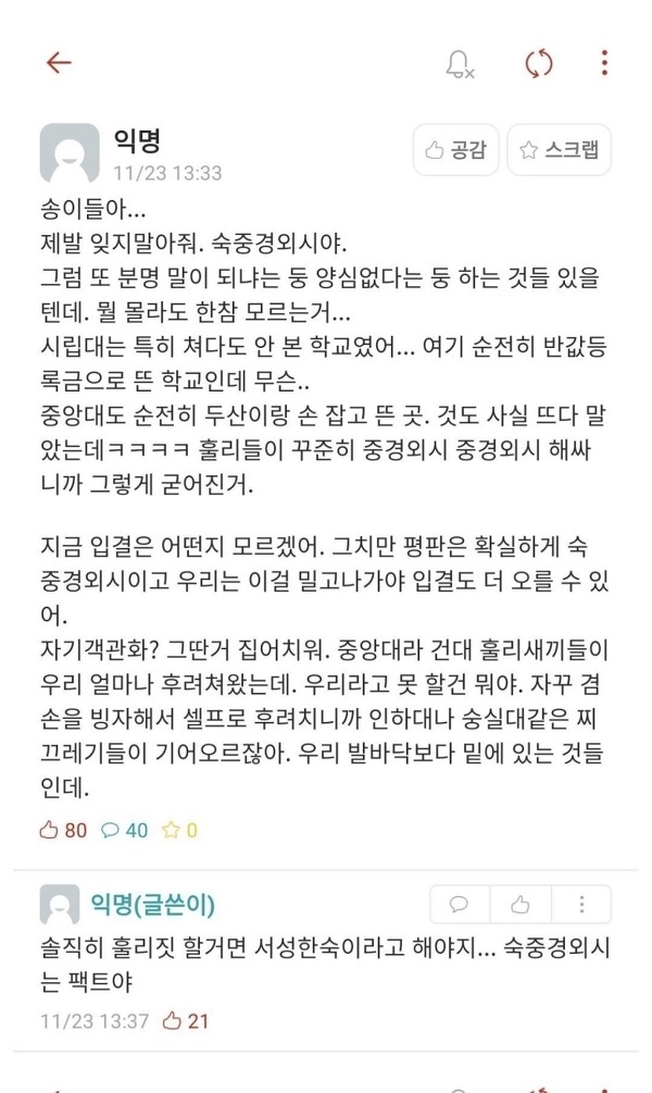 와 왜 굳이 홍대 안가고 숙대간거야? 이해불가능