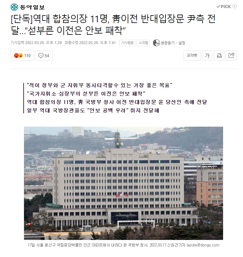 한미연합사령부가 안 옮겼으면 미친 짓이 맞음