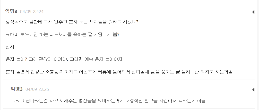그런 자신의 찐따냄새 풍기는 과거가 피해를 주는 행위라는걸 알다보니 커뮤에서 글쓰며 피해주는거 같은 동류인 찐따를 까내리며 안도감을 느끼려는 그런 부류?