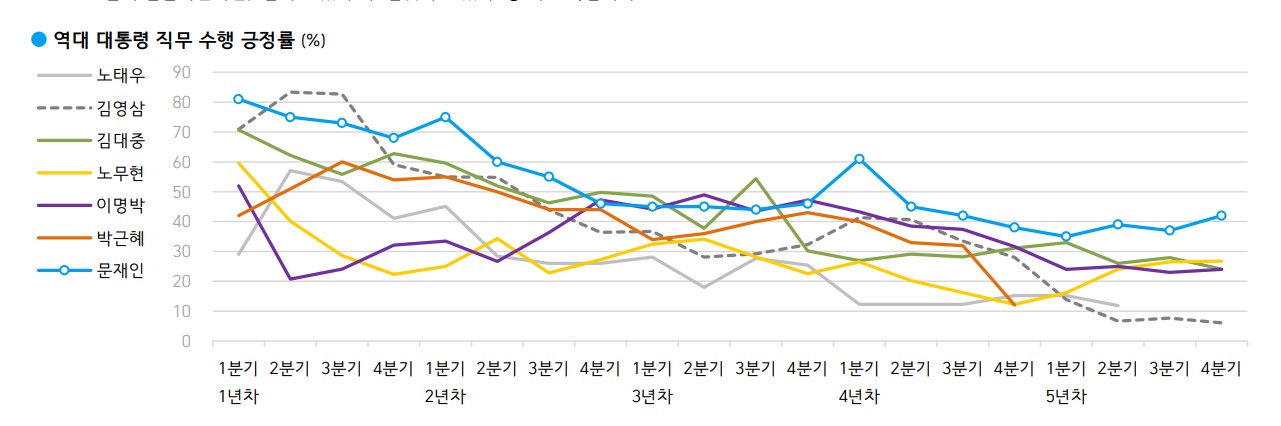 한 진영으로부터 꾸준하게 인정받고 있다는거 자체가 대단한거고, 대한민국 역사상 최초로 레임덕 없는 대통령이란 프레임만으로도 위인으로 평가 받을 것이다.