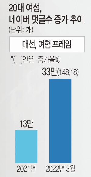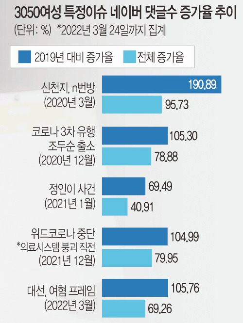 여성들은 남성들에 비해 정치 이슈에 목소리를 덜 내는 편이었지만 지난 대선 때는 조금 달랐다. 대선이 치러진 3월 3050 여성은 댓글 창에서 활발한 참여를 보이며 2019년 동월 대비 댓글수가 2배가량 늘었다. 당시 윤석열 국민의힘 대선 후보와 이준석 대표가 ‘여성가족부 폐지’ 등의 공약을 내세우며 여성 혐오 논란이 일었고, 이로 인한 남녀 갈등이 극에 달한 상황이었다.