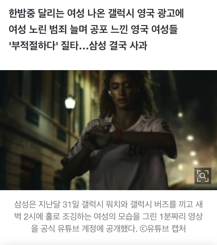 달리기 관련 온라인 커뮤니티 '미라런' 회원들은 삼성 광고에 대해서 "여성이 새벽에 안전하게 달리기하는 사치를 누리고 있다는 모습을 표현한 것처럼 보이지만 슬프게도 사실과 다르다"고 밝혔다.