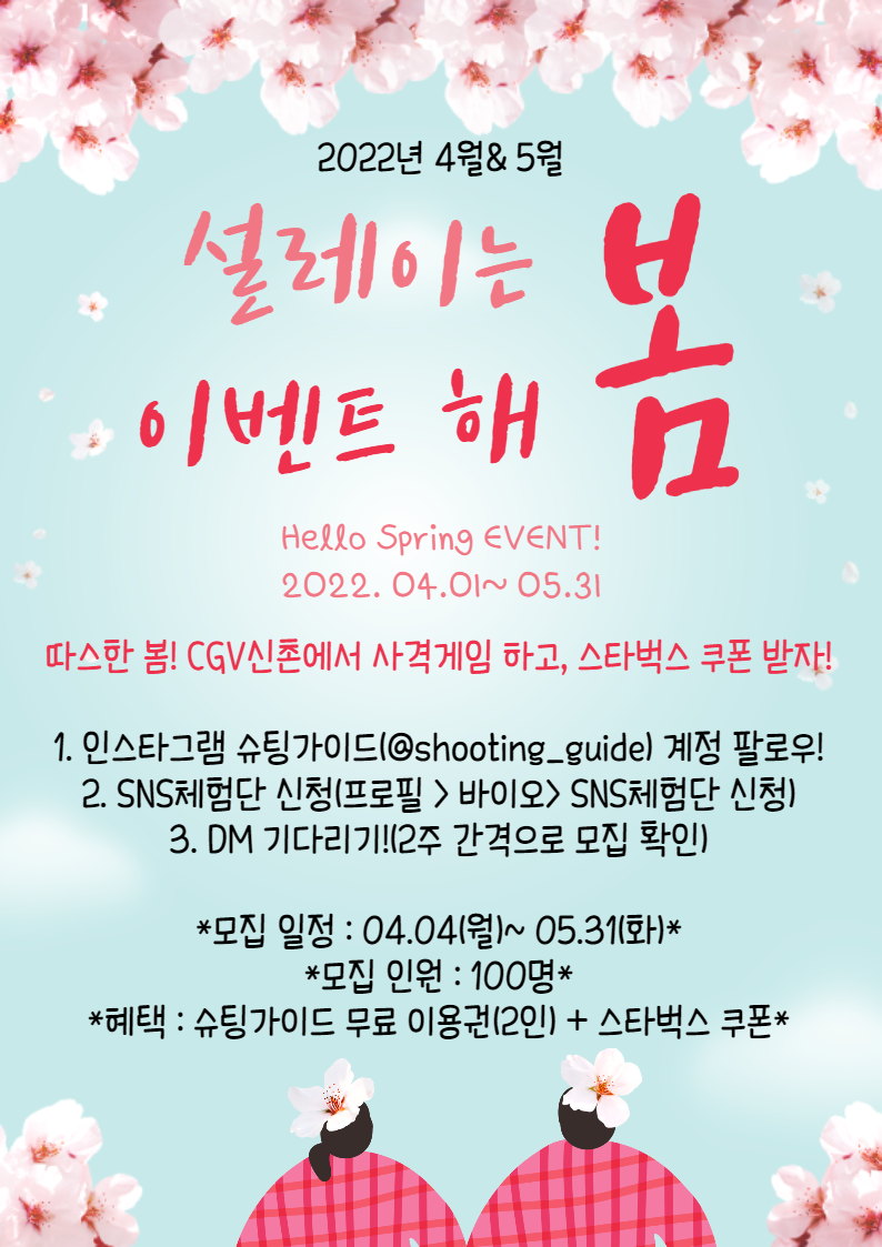 CGV 신촌 아트레온점에 새로이 런칭된 스크린사격장 슈팅가이드에서 체험단 이벤트를 진행 중입니다!CGV 신촌 아트레온점에서 슈팅가이드를 플레이하고 인스타 혹은 블로그에 리뷰를 포스팅 하시면 추첨을 통해 영화관람권(동반 1인) /슈팅가이드 무료이용권/ 스타벅스 쿠폰을 증정한다고 하니 많은 관심 부탁드립니다.