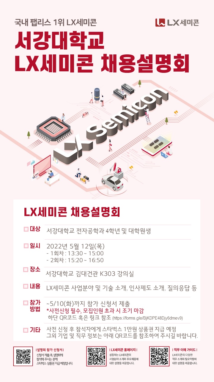 국내 팹리스 1위! LX세미콘에서 5월 12일 채용설명회를 진행합니다. 하단의 URL을 통해 신청할 수 있으며, 많은 관심과 참여 부탁드립니다:)