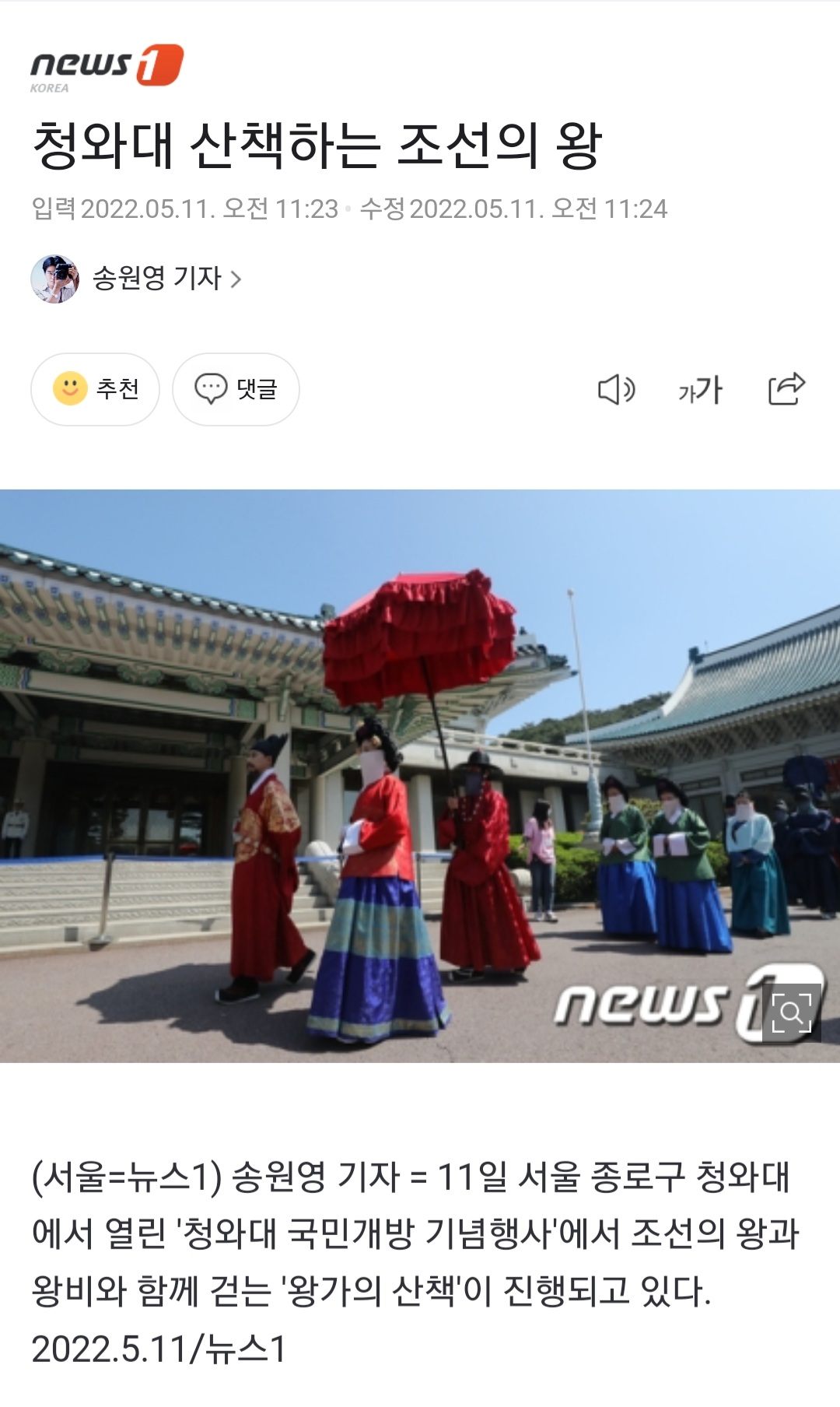 난 용산 이전 나쁘지 않다고 보는 입장이지만 대통령은 공화국의 대표고 청와대는 공화국의 유산임. 대한민국은 전제왕정이었던 조선을 계승하는 국가가 아닌데 왜 저런 거 하는지..