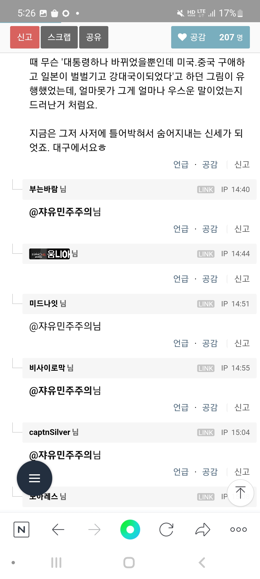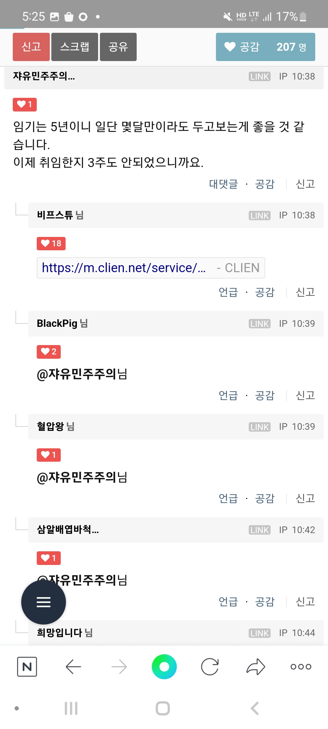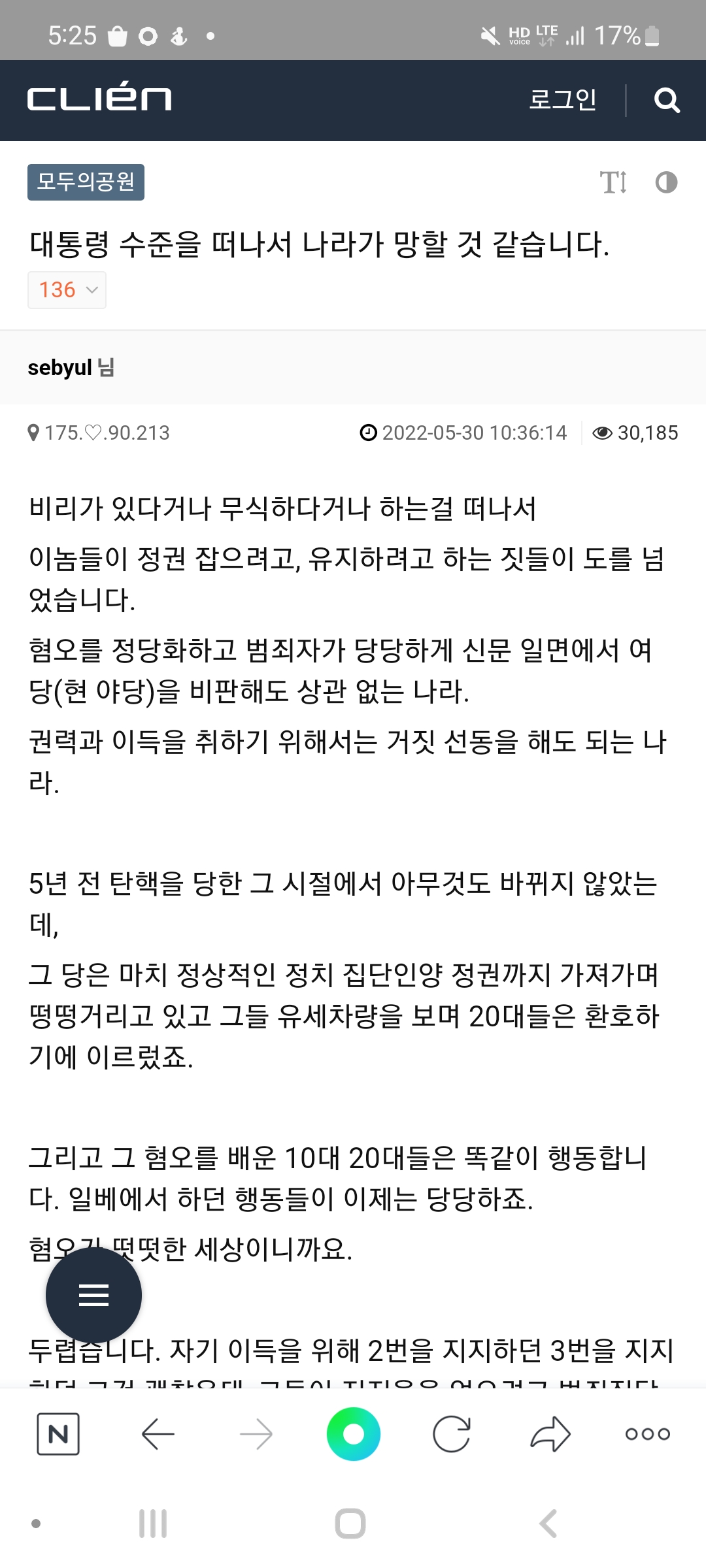 생각이 다를 수 있는데 윤석열 비판하고 나라망할거 같다는 인기글에 2명정도가 반박하고 좀만 기다려보자 지켜봐도 되지 않나 이랬더니 관리자가 삭제시키고 님 님 님 계속 이러면서 테그 붙이더라.