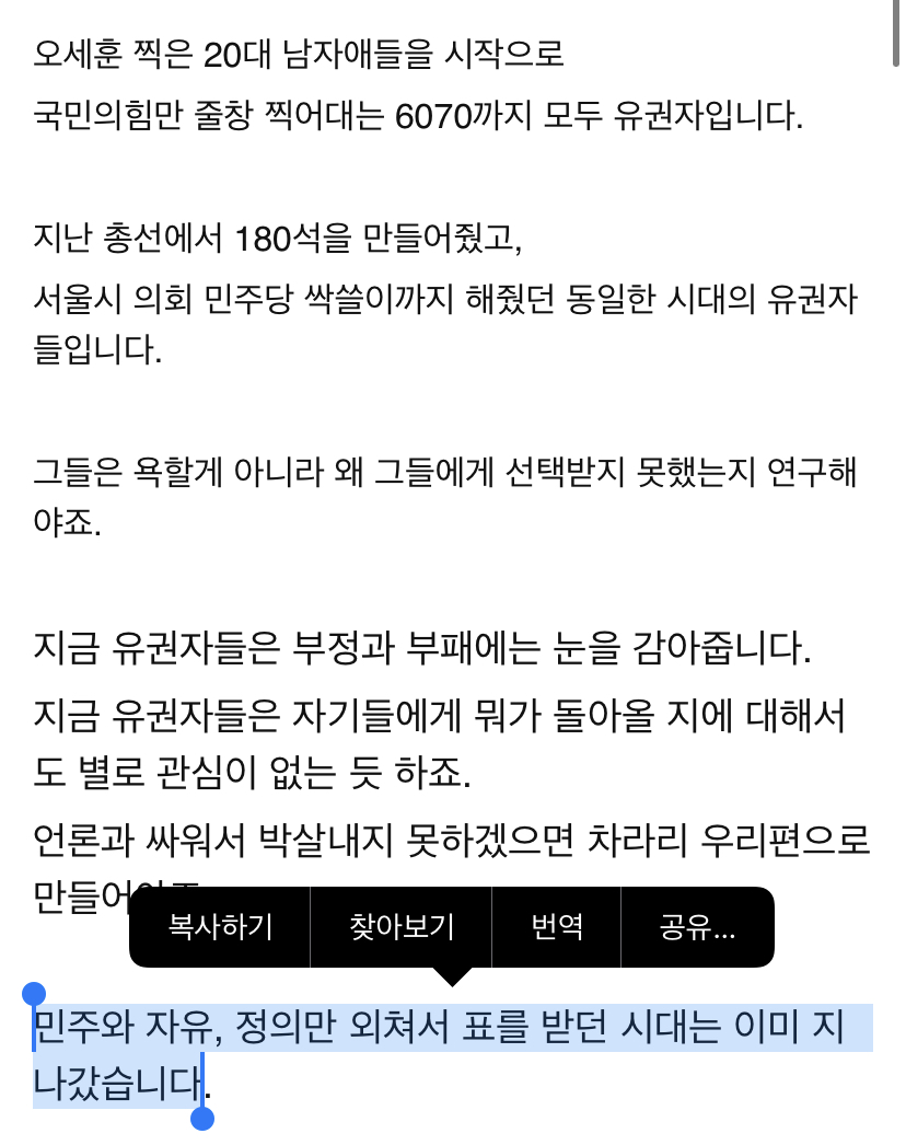 너의 병신같은 해석은 글의 앞부분 지금 국힘 뽑은 국민도 한때 우리 180석 만들어준 국민이다. 라는 문장과의 체계정합성 또한 전혀 없음