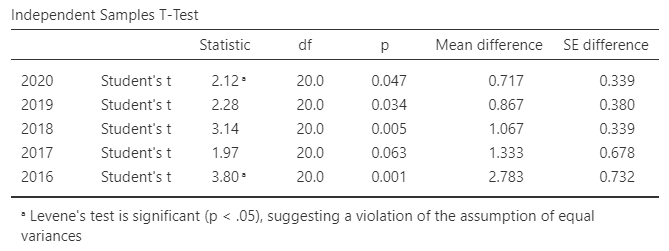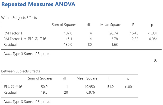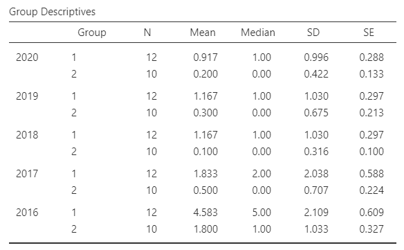 그렇다면 안전운임제의 도입이 실질적인 사고 발생에 기여했을까? 다음은 각 연도의 사고 발생 건수를 비교한 결과이다. 시계열 자료임을 고려하여 Jamovi의 Repeated Measure ANOVA로 분석하였다.