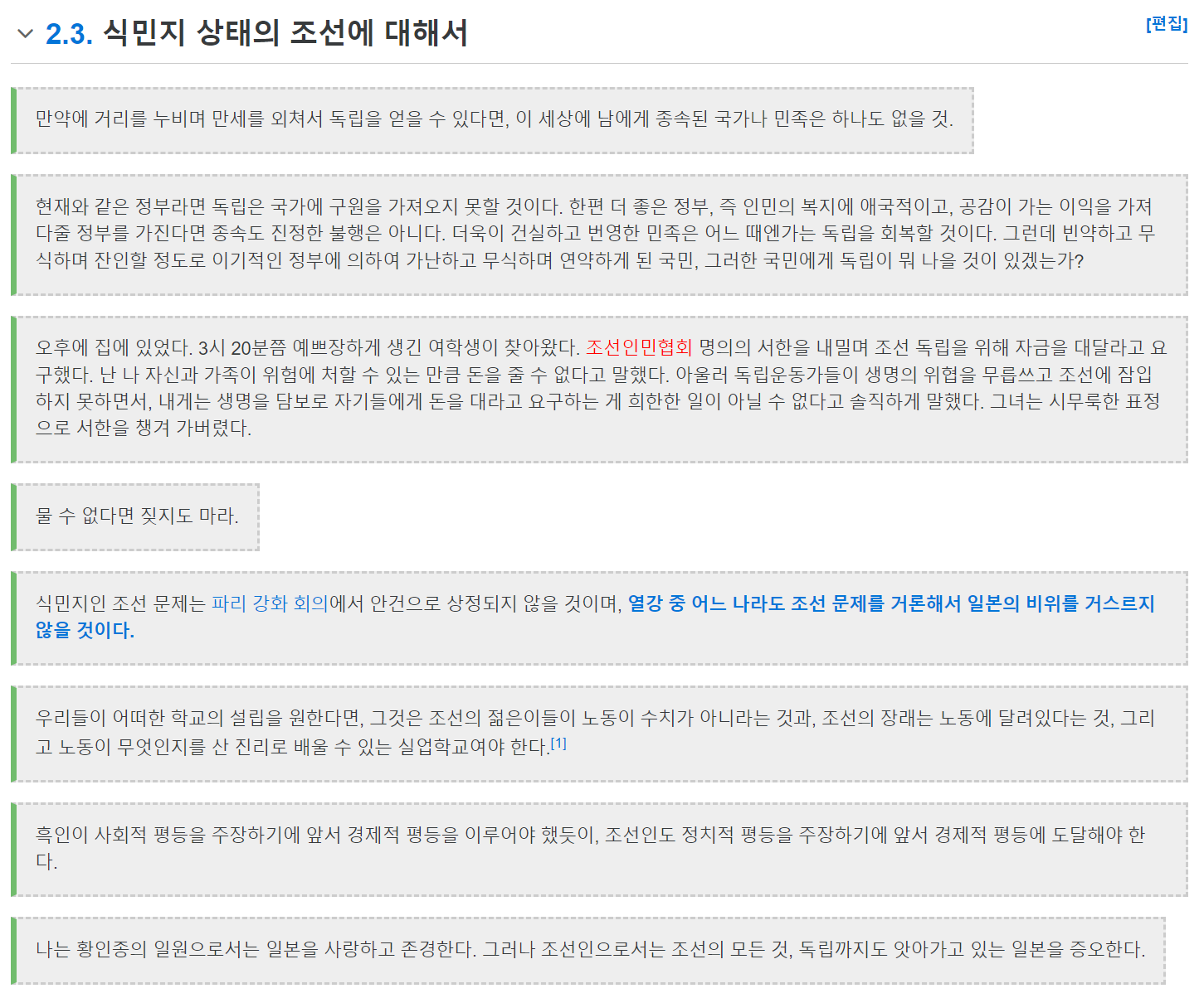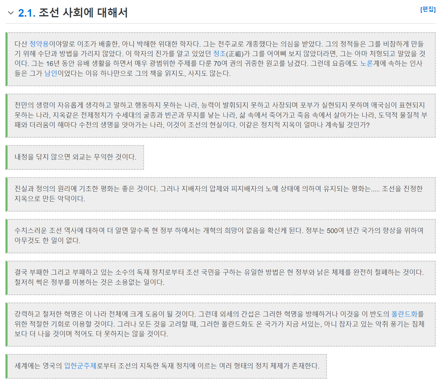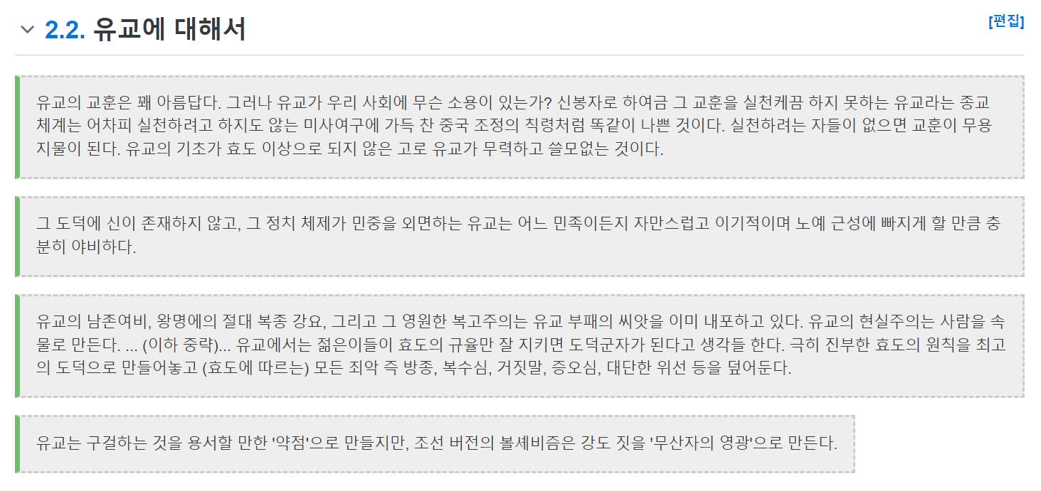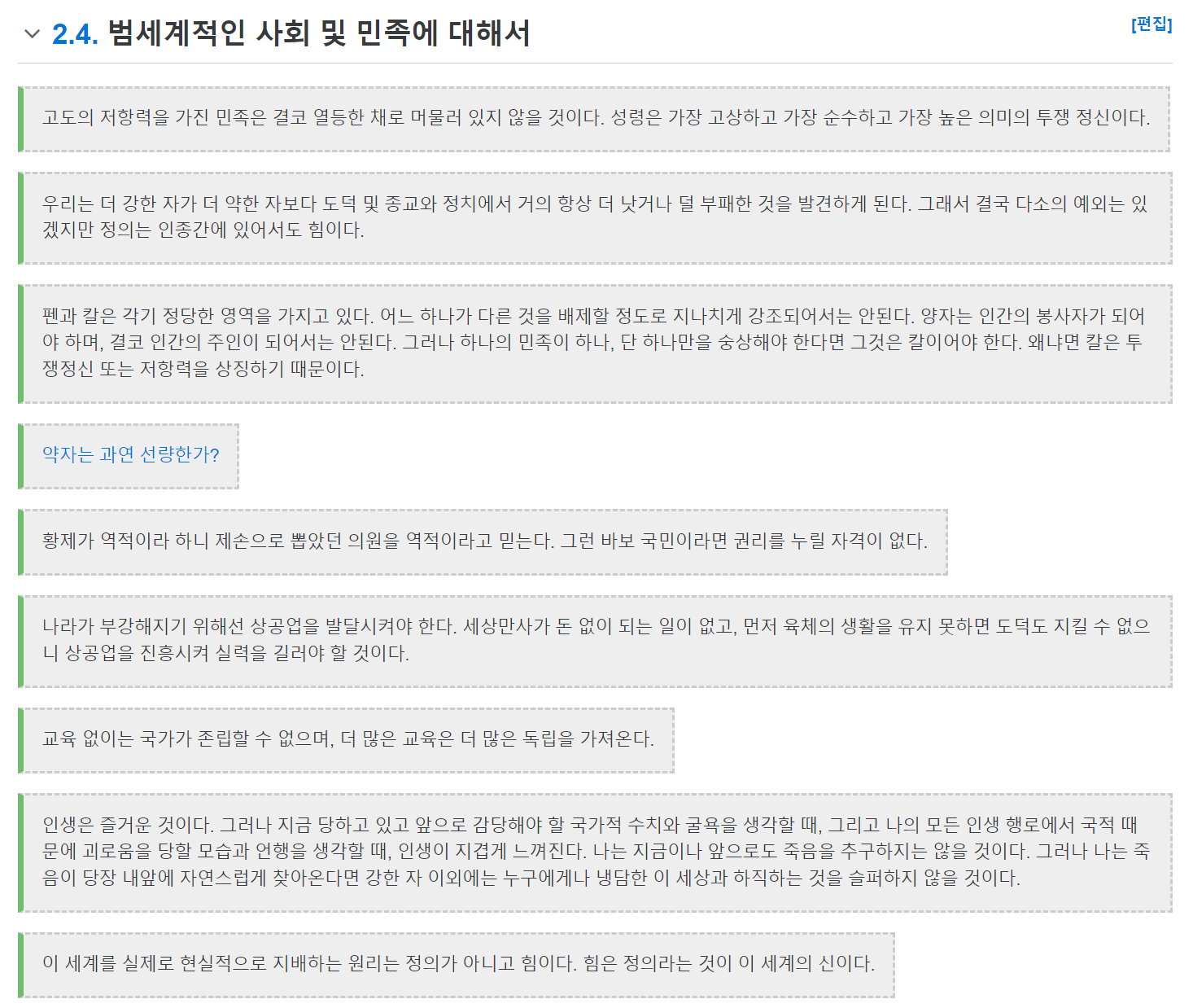 구구절절 맞는 말이노..역시 19세기 조선에서 태어난 사람이지만 미국 명문 에모리 대학에서 유학하고 온 사람답게 미친 통찰력 ㄷㄷ 특히 유교에 대한 어록이 인상 깊었다