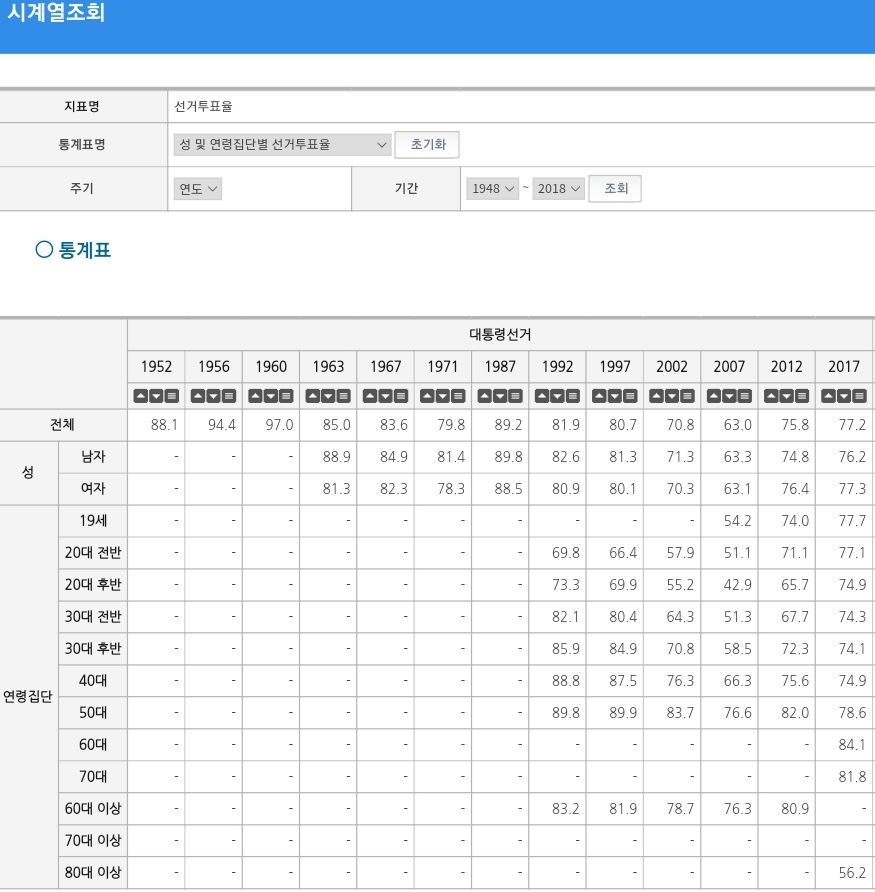 펨코에서 이번 20대가 역대 투표율 가장 높다고 자꾸만 올려치길래 찾아보니