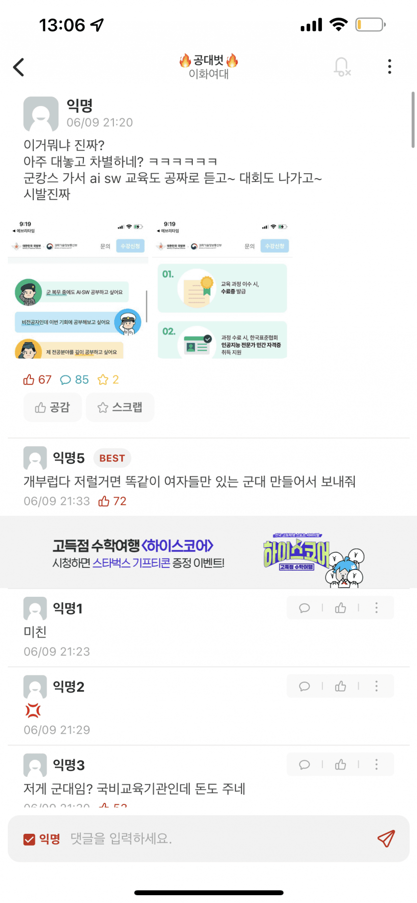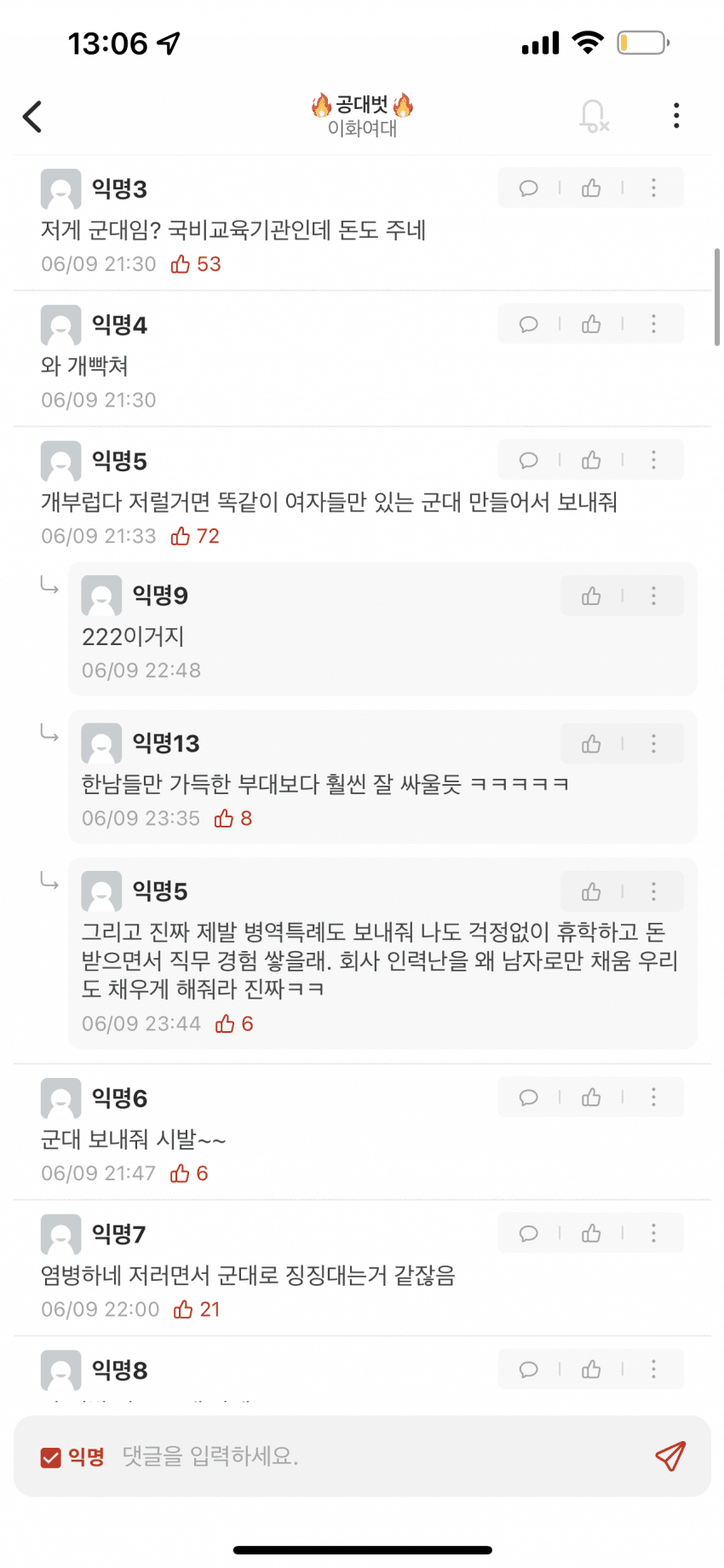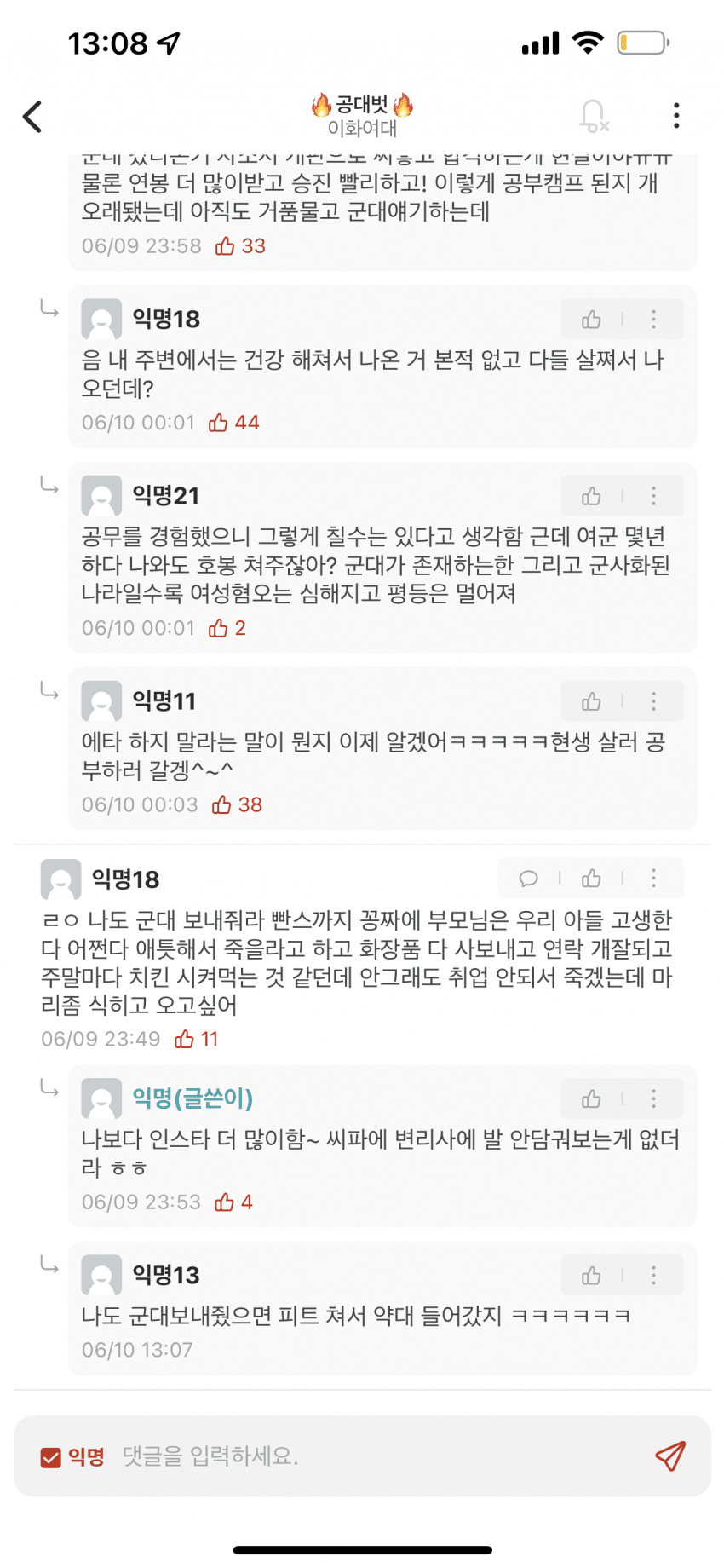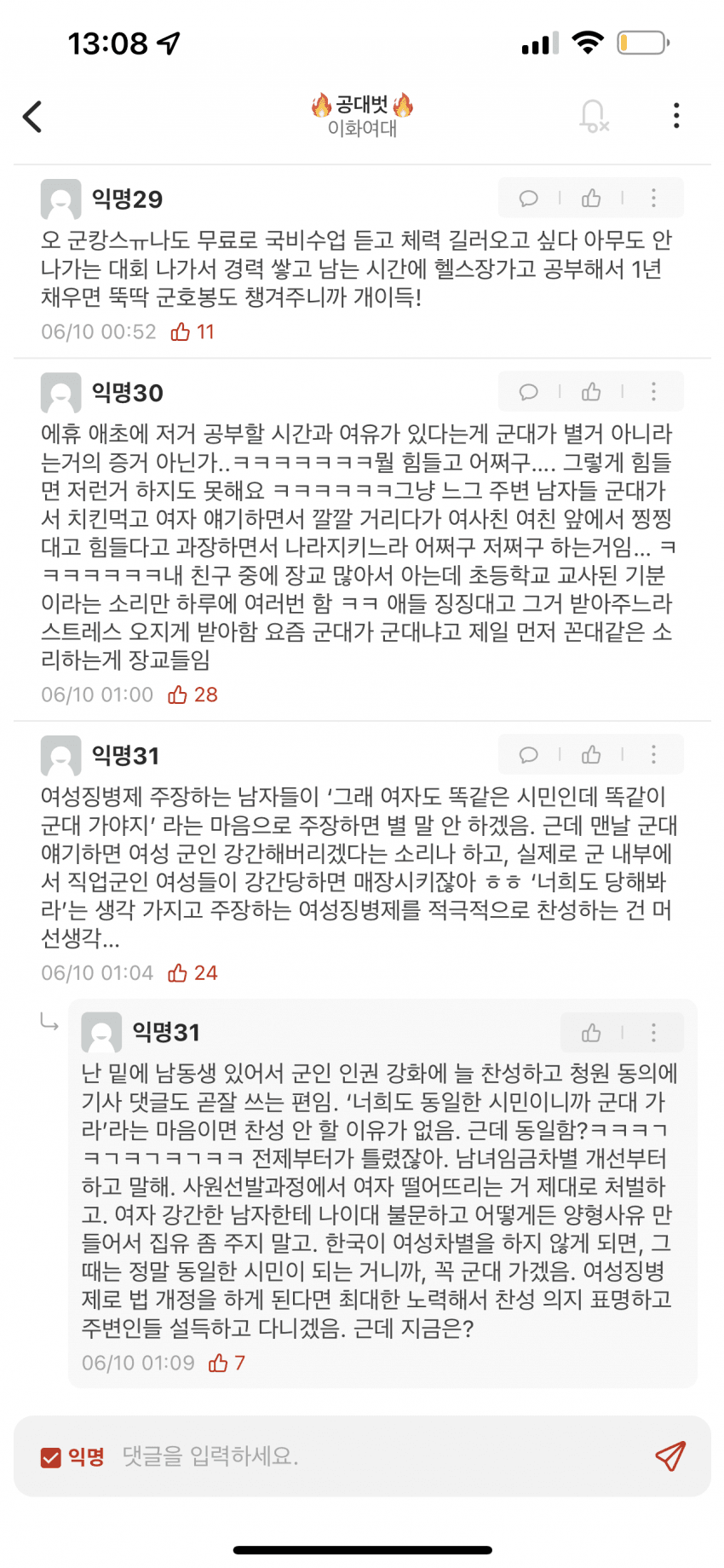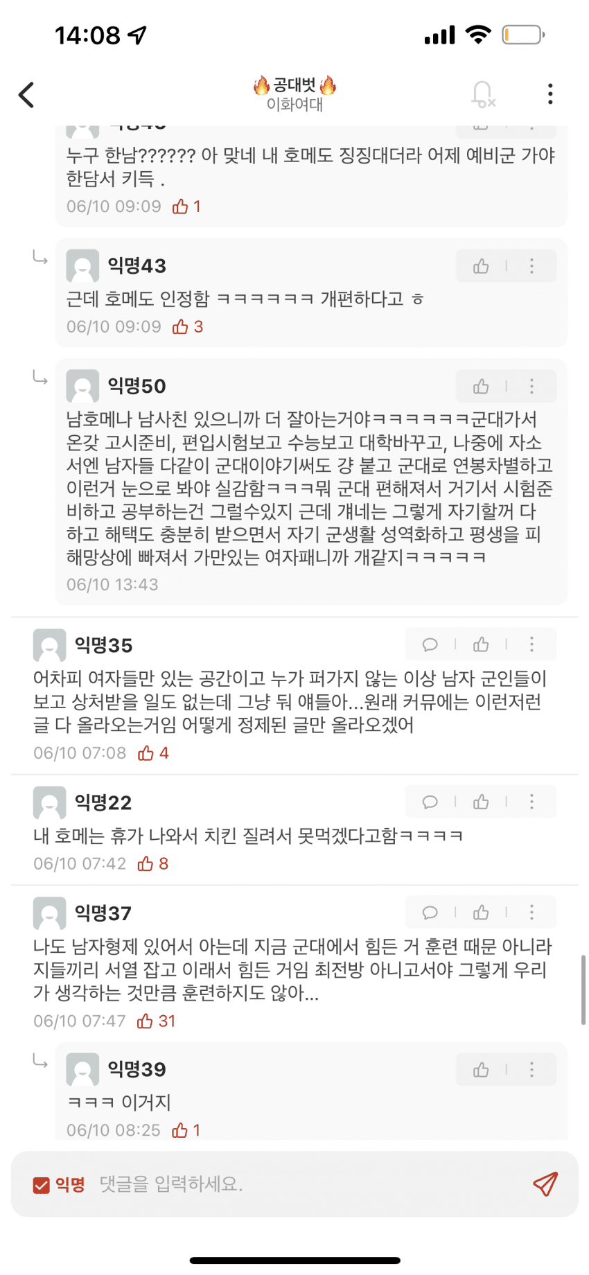 그러게 ㅋㅋ 군대 억지로 보낸건 기득권 남자인데 화는 이대여자들한테 내는 신기한? 모습