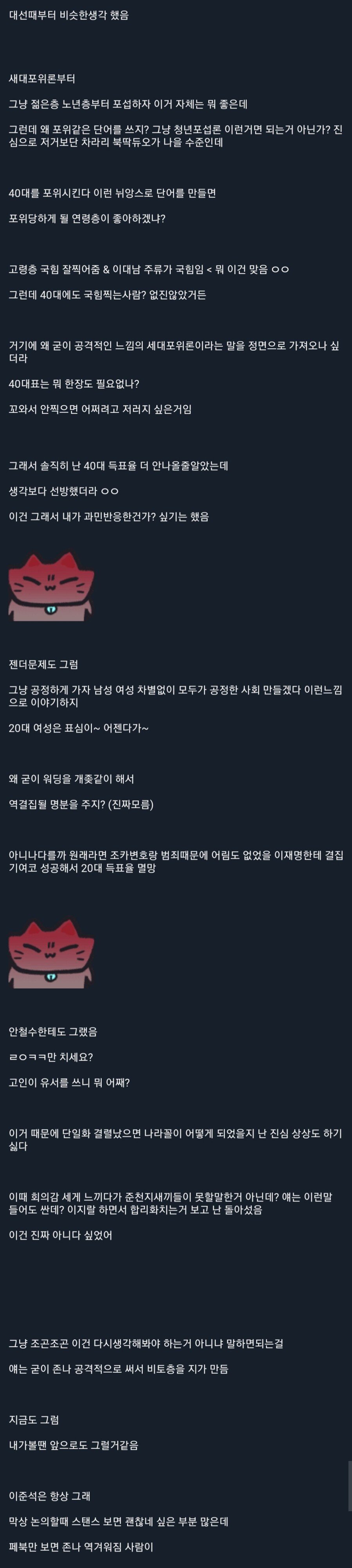 이러나저러나 그냥 선거이겼으니 된거지 막말로 글에서 말하는것처럼 단일화 결렬될수도있었음 근데 안됐잖아 세대포위론, 젠더문제 공격적으로 언급했지 근데 중년층 표 다잃어버리지도않았고 여성표? 오히려 많이끌어왔음