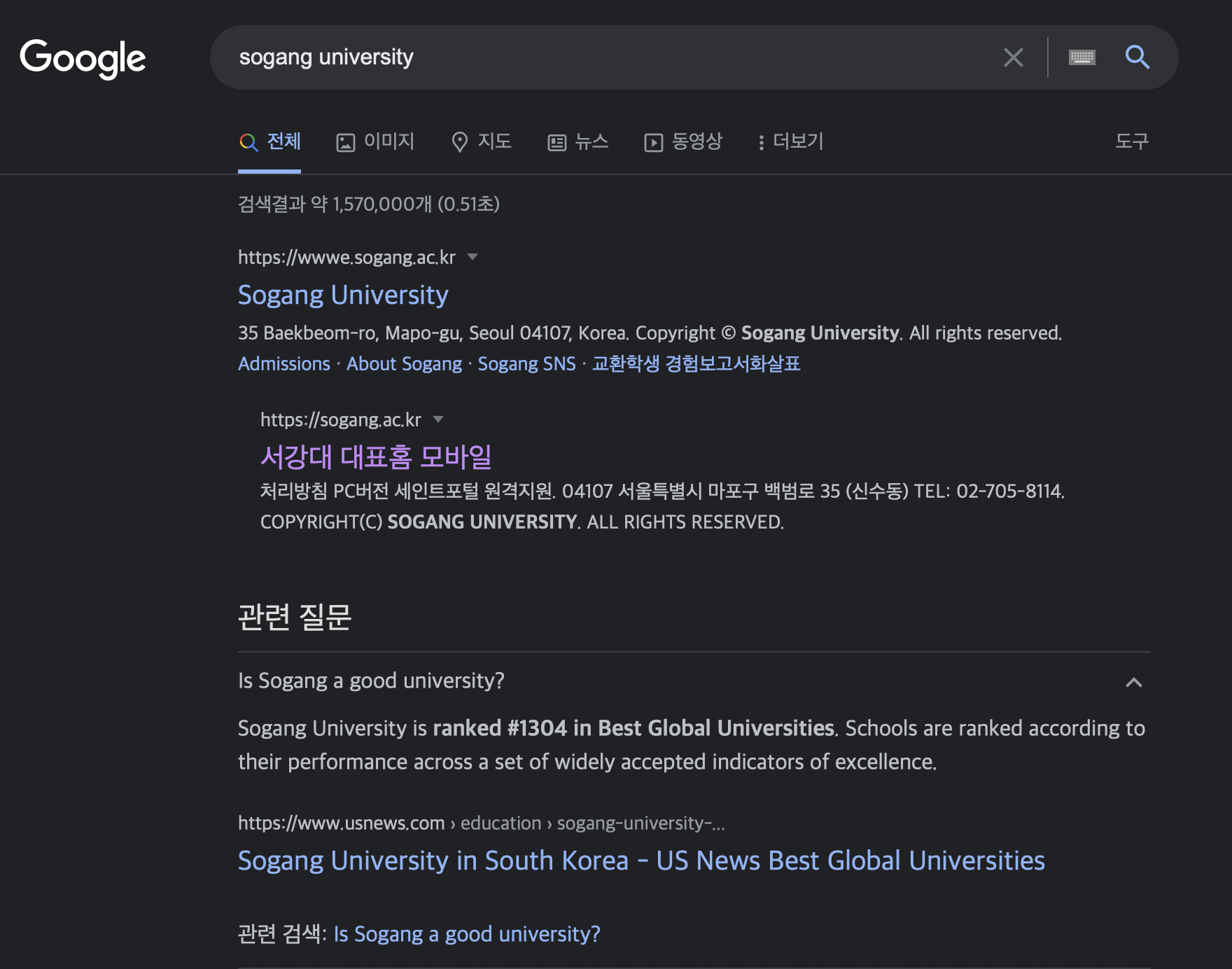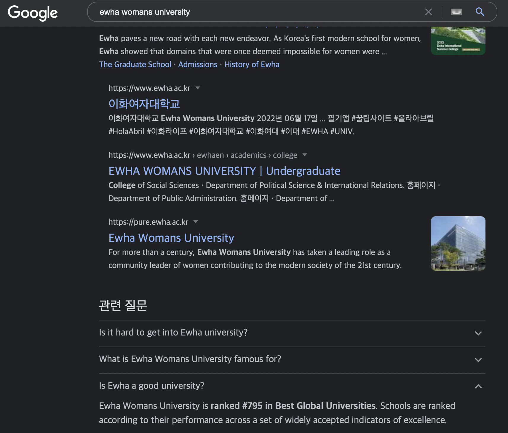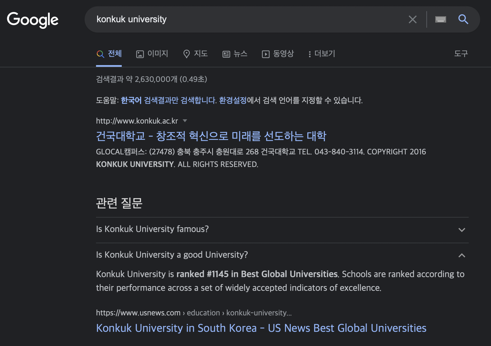 그리고 us news순위는 우리학교 순위 좆박은거 맞긴함. qs순위는 400몇위인가해서 한국 내에서 탑텐 안에는 들긴함. 그래서 한국 유학 관련된 기사들 보면 나름 꾸준히 언급 되고 있기도하고(해외에선 qs랑 us 둘다 보니깐). 구글 알고리즘이 us news 순위만으로 자동 답변하게 되어있나보네.