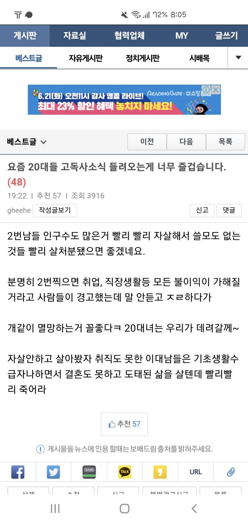 2대녀 타령 안했으면 그냥 흔한 세대갈등론인데 그 한줄이 정말 정신을 혼미하게 함 2대남들이 아래로 잼민이 급식충 욕하고 위로 586, 틀딱 욕해도 저렇게 추하진 않는데ㅋㅋ;; 4대녀 5대녀 타령은 무리래도 1대녀 타령은 나와야 동급인데 참 쉽지않다