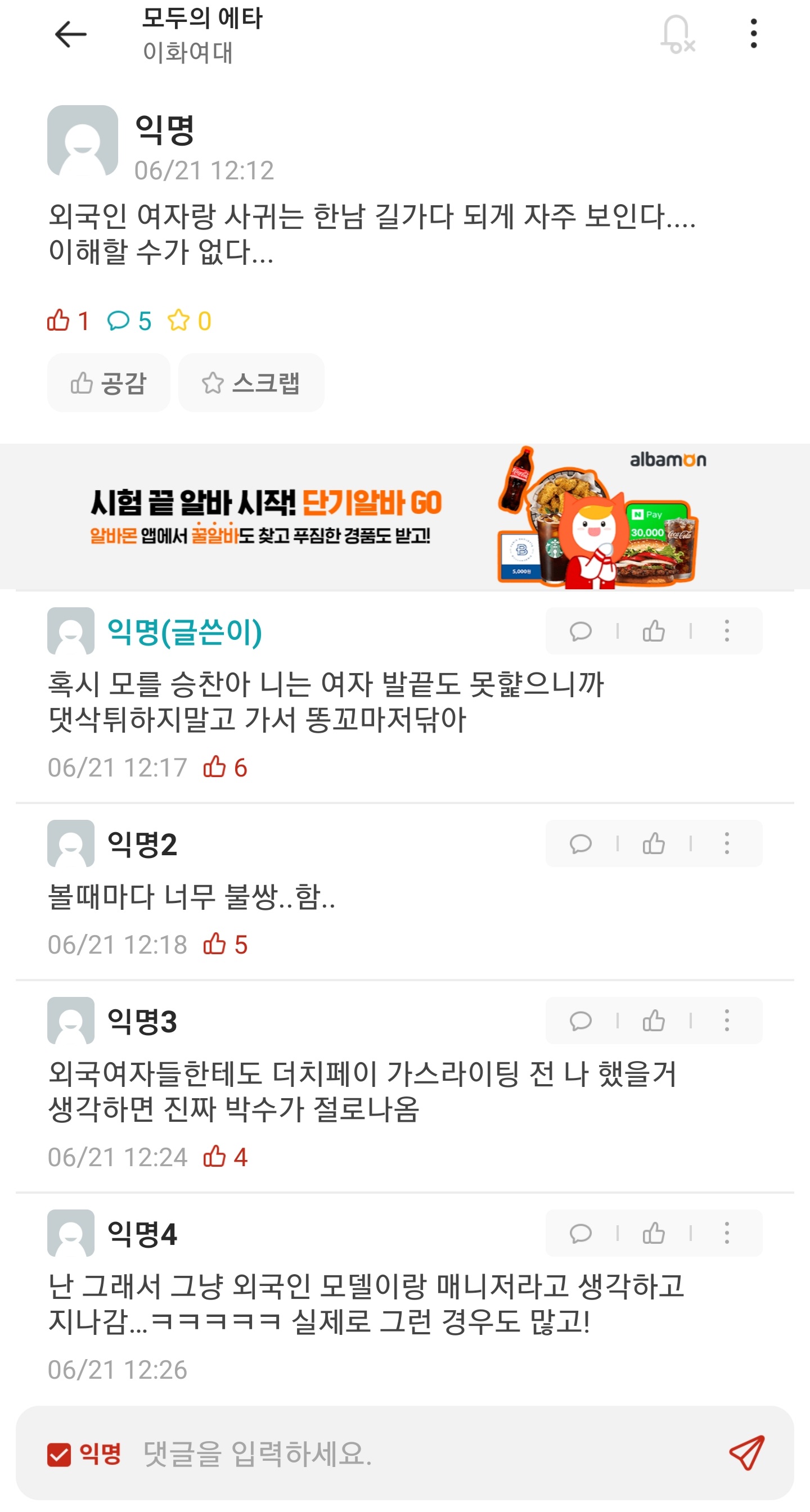말로는 한남한테 관심 없다고하지만 한남이 안 만나주고 외국여자 사귀면 그 누구보다 ㅂㄷㅂㄷ하네ㅋㅋㅋㅋㅋㅋㅋㅋㅋ