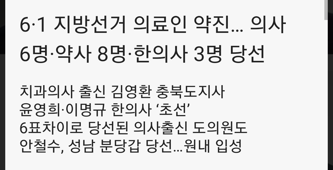 안뭉친다고 했는데 그건 뭉쳐서 권력의 도움을 받았을 때 어느정도 혜택이 있는지 느껴보지 않았기 때문임. 하지만 이제 정치 입문하는 의사들 많아지니까 서로 뭉쳐서 권력 맛도 보고 그러면 지금처럼 모래알 같이 개인플레이하는 분위기 줄어들거라 생각함.