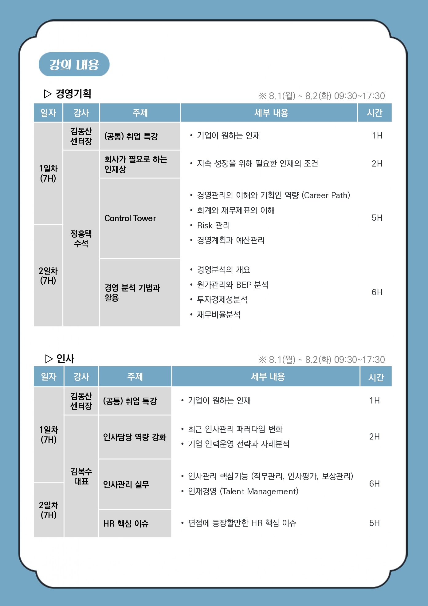 o 총 5개 과정 : 경영기획, 인사, 재무, 마케팅, R&D 분야